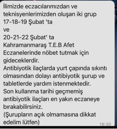 Karaman Eczacılar odası afet bölgesinde nöbetçi eczanelerde nöbet tutmak için gideceklerini belirtirken şu ifadeleri kullandı;İlimizde eczacılarımızdan ve teknisyenlerimizden oluşan iki gurup 17-18-19 Şubat'ta ve 20-21-22 Şubat'ta Kahramanmaraş T.E.B. Afet Eczanelerinde nöbet tutmak için gideceklerdir. Antibiyotik ilaçlarda yurt çapında sıkıntı olmasından dolayı antibiyotik şurup ve tabletlerde yardım istenmektedir. Son kullanma tarihi geçmemiş antibiyotik ilaçları en yakın eczaneye bırakabilirsiniz. (Şurupların açık olmamasına dikkat edelim lütfen)