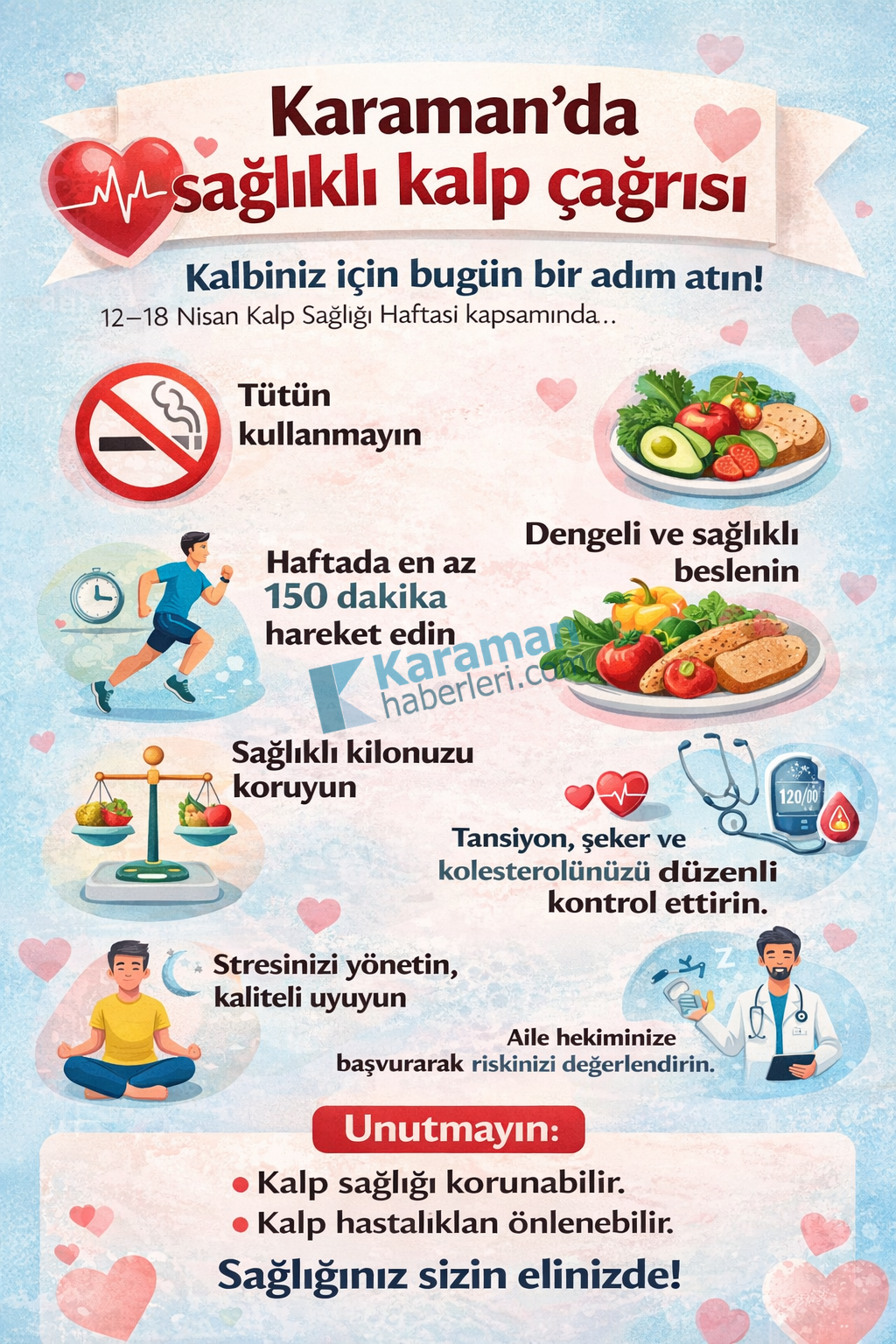 Karaman İl Sağlık Müdürlüğü’nün paylaşımına göre 12–18 Nisan Kalp Sağlığı Haftası kapsamında kalp ve damar hastalıklarına karşı farkındalık çağrısı yapıldı.Açıklamada, Türkiye’de her 4 ölümden 1’inin kalp ve damar hastalıkları nedeniyle gerçekleştiği hatırlatıldı. Ancak bu hastalıkların büyük bölümünün önlenebilir olduğuna dikkat çekildi.KALBİNİZ İÇİN BUGÜN ADIM ATINYetkililer, sağlıklı bir kalp için vatandaşlara önemli tavsiyelerde bulundu. Buna göre tütün kullanımından uzak durulması, dengeli ve sağlıklı beslenilmesi, haftada en az 150 dakika fiziksel aktivite yapılması ve sağlıklı kilonun korunması istendi.DÜZENLİ KONTROL VURGUSUTansiyon, şeker ve kolesterol değerlerinin düzenli takip edilmesi gerektiği belirtilirken, stres yönetimi ve kaliteli uykunun da kalp sağlığında önemli rol oynadığı ifade edildi.Ayrıca vatandaşların aile hekimlerine başvurarak risk değerlendirmesi yaptırmalarının ihmal edilmemesi gerektiği kaydedildi.Karaman İl Sağlık Müdürlüğü, kalp sağlığının korunabileceğini ve kalp hastalıklarının önlenebileceğini vurgulayarak, sağlıklı yaşam alışkanlıklarının önemine dikkat çekti.