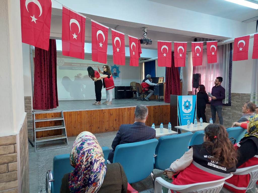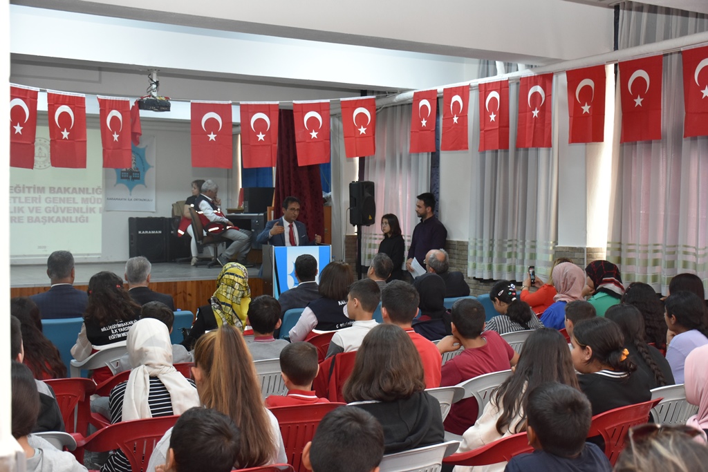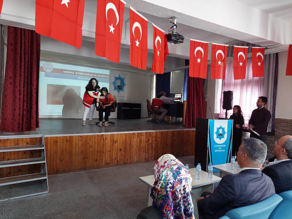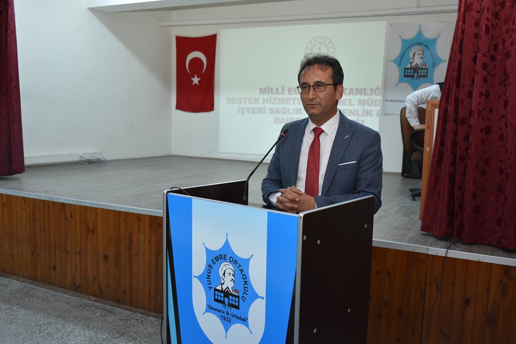 İl Millî Eğitim Müdürü Mehmet Çalışkan Yunus Emre Ortaokulunda gerçekleşen 37. İş Sağlığı ve Güvenliği Haftası ile Trafik ve İlkyardım Haftası nedeniyle düzenlenen etkinliğe katıldı.Çalışma ve Sosyal Güvenlik Bakanlığının ülke genelinde gerçekleştirdiği 37. İş Sağlığı ve Güvenliği Haftası etkinliği ile 1-7 Mayıs tarihleri arasında Trafik ve İlkyardım Haftası kutlamaları kapsamında İl Millî Eğitim Müdürü Mehmet Çalışkan, Yunus Emre Ortaokulunda düzenlenen programa katıldı.Programda konuşan İl Millî Eğitim Müdürü Mehmet Çalışkan, iş sağlığı ve güvenliği ile trafik ve ilkyardım kavramlarının insan hayatının vazgeçilmez unsurlardan olduğunu söyledi.Çalışkan, “Öğrencilerimizle böyle programlarda bir araya gelmek bizleri mutlu ediyor. İnsan var olmaya başladığı günden bugüne her zaman kendisini güvene alma hissi oluşmuştur. Geçmiş yıllara göre artık insanlar, köylerden çok şehirlerde yaşamayı tercih etmiştir. Tabi bu tercihin getirisi olduğu gibi götürüsü de elbette ki vardır. Bu bağlamda şehir hayatını düzenlemek adına iş hayatında ve trafikte kurallar oluşturulmuş ve oluşturulan bu kurallar devletler tarafından uygulamaya konulmuştur. Kuralların temel amacı toplumsal hayatı düzenleyerek insanların hayatını kolaylaştırmak yani insan hayatını teminat altına almaktır. Bizim anlayışımıza baktığınızda eskilerin de dediği gibi önce tedbirimizi alır sonra tevekkül ederiz. Yaşamımızın her alanına bu düsturu yerleştirmemiz gerekir. Aynı şekilde bu kuralı trafikte uygulamalıyız. Kurallara uyduğumuz sürece dünya daha yaşanılabilir bir alan haline dönüşür. Dolasıyla bu tür etkinlikleri önemsiyoruz. Programın düzenlemesinde emeği geçenlere teşekkür ediyor, İş Sağlığı ve Güvenliği Haftamız ile Trafik ve İlkyardım Haftamız kutlu olmasını diliyorum.” dedi. İl Millî Eğitim Müdürü Mehmet Çalışkan konuşmasının ardından trafik ve ilkyardım konusunda Karaman İl Emniyet Müdürlüğünde görevli Trafik Polisi Sercan Yıldız, iş sağlığı ve güvenliği konusunda ise İlkyardım Mesul Müdürü Emine Çoğun, MEB AKUB Lideri Aslı Yardım ile Diyetisyen Nur Gönen tarafından öğrencilere sunumlar yapıldı. Türkiye’de trafik kazalarına dikkat çekmek ve farkındalık oluşturmak amacıyla mayıs ayının ilk haftası "Trafik ve İlkyardım Haftası" olarak kabul edilmiştir. Bu hafta süresince; yayın organları aracılığı ile trafik kazalarının önlenmesi için trafik kurallarına uymanın ve ilk yardımın önemi vurgulanmaktadır. Bu yıl trafik haftası 1-7 Mayıs tarihleri arasında kutlanıyor. Yine ülkemizde 1987 yılından bu yana her yıl 4-10 Mayıs tarihleri arası "İş Sağlığı ve Güvenliği Haftası" olarak kutlanıyor.