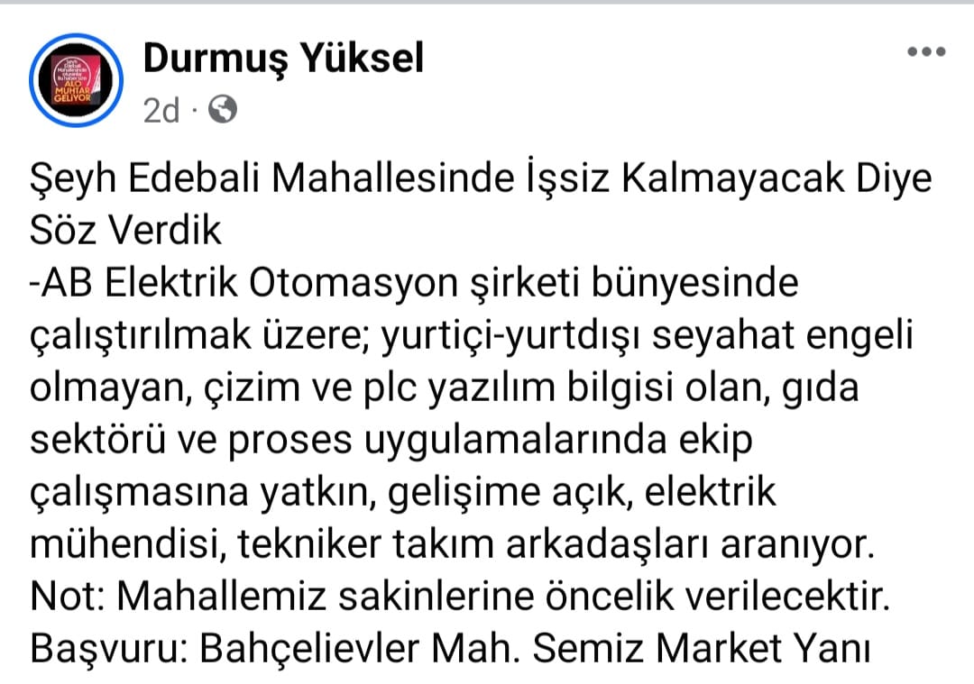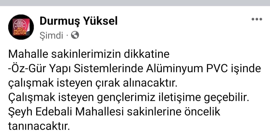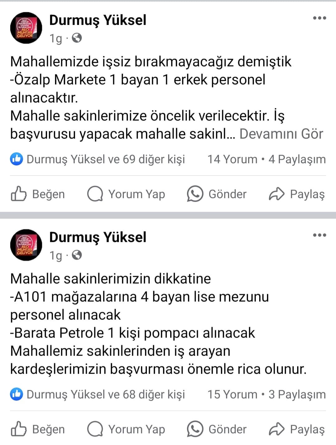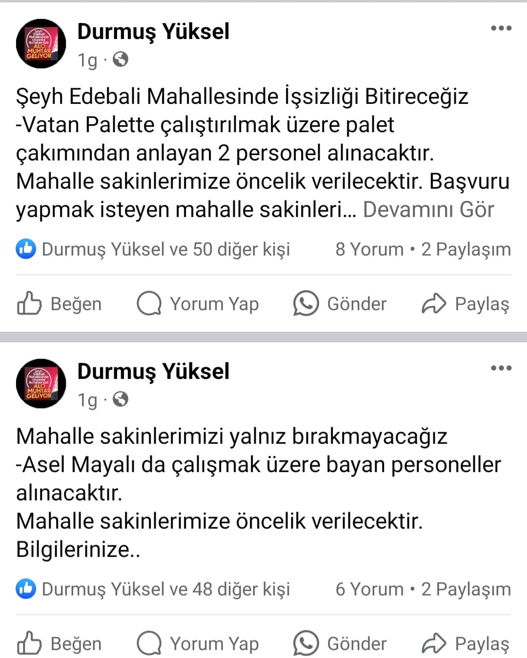 15 yıldır birçok hizmetten mahrum kalan Şeyh Edebali Mahallesine hizmet getiren proje adamı ve muhtar adayı Durmuş Yüksel ilklere imza atmaya devam ediyor. Ekmek Büfesini Şeyh Edebali Mahallesine getirerek kendini kanıtlayan Durmuş Yüksel, işsiz mahalle sakinleri için kolları sıvadı. Adeta her gün iş ilanı paylaşan Durmuş Yüksel, Şeyh Edebali Mahallesinden iş başvurusu yapanlara öncelik sağlattırıyor. İlk defa bir muhtar adayı mahallenin en büyük sorununa el atarak tüm Karaman’ın takdirini topladı. Durmuş Yüksel’in muhtar olunca adeta Şeyh Edebali Mahallesinde işsiz hiçbir mahalle sakini kalmayacak.“İŞKUR MAHALLE PROJESİ”Karaman’da mahallesi için gece gündüz çalışan Muhtar Adayı Durmuş Yüksel birçok proje açıklayarak yola çıkmıştı. İlk başta muhtar adayı nasıl projeleri yapsın denirken bir anda çalışkan Muhtar Adayı Durmuş Yüksel seçilmeden projelerini hayata geçirdi. Ekmek Büfesi projesini hayata geçiren Şeyh Edebali Mahallesi Muhtar Adayı Durmuş Yüksel, Karaman’a örnek bir projeyi daha hayata geçirdi. “İŞKUR Mahalle” projesi kapsamında Şeyh Edebali Mahallesi Muhtar Adayı iş ilanları paylaşıyor ve mahalleden işe girmek isteyenlere öncelik sağlattırıyor. Bu proje bırakın Şeyh Edebali Mahallesini tüm Karaman’a örnek oldu.“MAHALLEMİZDE İŞSİZ KALMAYACAK”Şeyh Edebali Mahallesinin hizmet adamı ve muhtar adayı Durmuş Yüksel projesini mahallemizde işsiz kalmayacak diyerek duyurmuş ve “İş bulma konusunda sıkıntı yaşayanlar için gerekirse kapı kapı dolaşıp iş sahibi olmalarını sağlayacağız. Bu noktada ticaret hayatımızda sıklıkla karşılaştığımız personel eksiği olan işletmelere öncelikli olarak mahallemizden personel alınmasını sağlayacağız” ifadelerine yer vermişti.