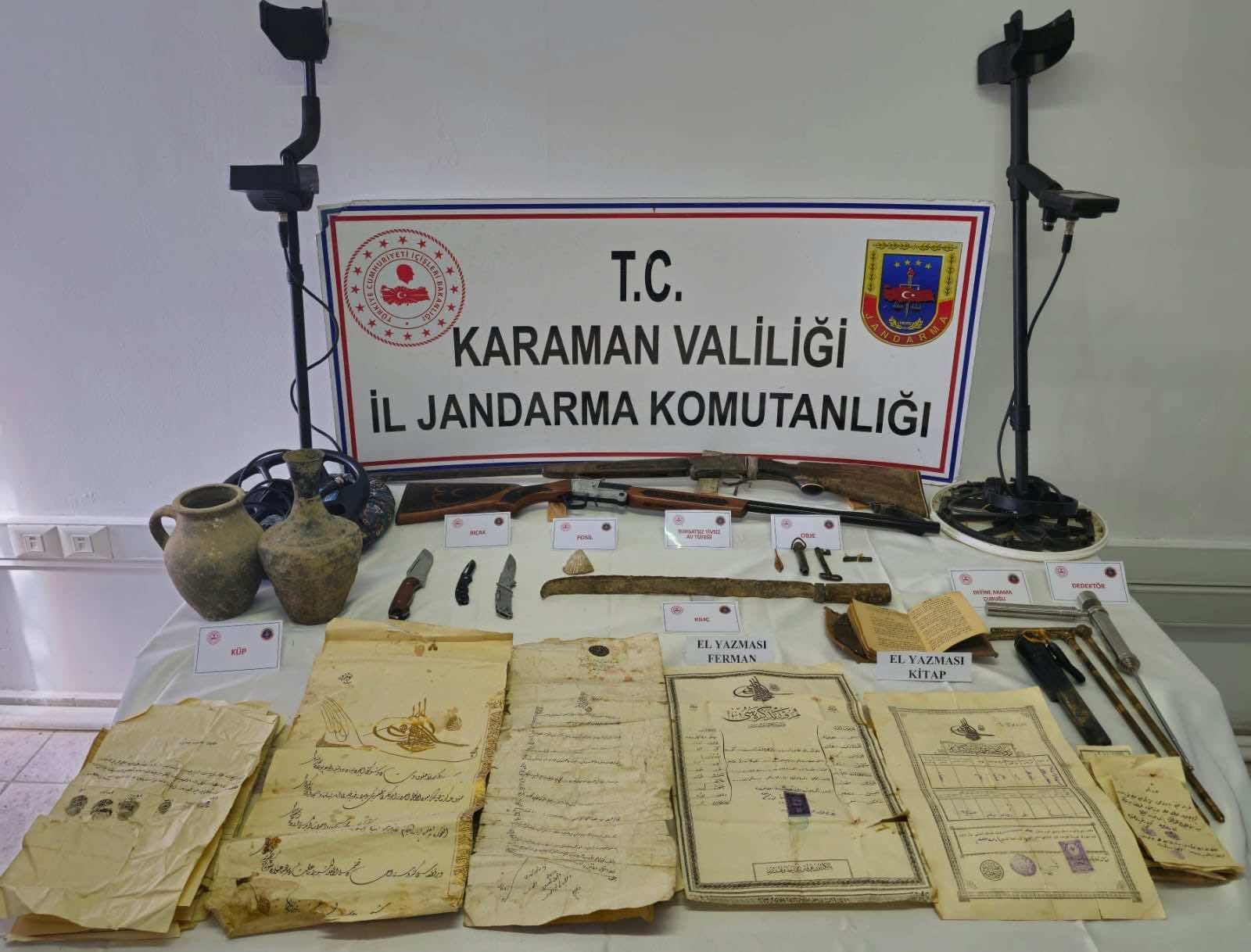 • (4) araç sürücüsüne ehliyetsiz/yetersiz araç kullanmaktan,• (2) araç sürücüsüne alkollü araç kullanmaktan işlem yapılmış,• (9) araç trafikten men edilmiş,• (2) sürücü belgesine el konulmuştur. Denetimler esnasında; (3) Adet Ruhsatsız Tabanca , (2) Adet Ruhsatsız Kuru Sıkı Tabanca, (2) Adet Ruhsatsız Av Tüfeği, (37) Adet 9 mm Tabanca Mermisi, (3) Adet Bıçak, , Esrar Maddesi, Sentetik Ecza Hap (1) adet Osmanlı dönemine ait el yazması kitap, (2) adet Roma dönemine ait küp, (3) adet Roma Dönemine ait demir obje, (2) adet Osmanlı Dönemine ait demir mühür, (1) Adet Osmanlı Dönemine ait Kılıç, (2) adet Dijital Define Arama Dedektörü ve (6) Adet Aparat, (1) Adet Define Arama Dedektörü, (2) Adet L şekilli Define Arama Çubuğu, (1) Adet Elektronik Pointer ve (1) Adet Kurum Kimlik Kartı ele geçirilmiştir.