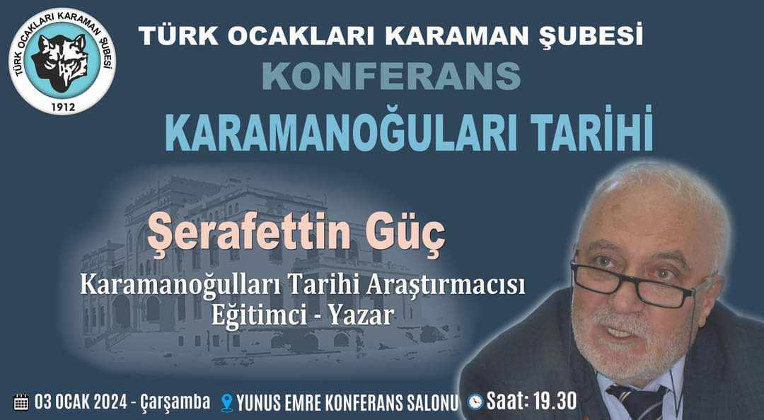 Karamanoğulları Tarihi Araştırmacısı Eğitimci Yazar Şerafettin Güç, Karaman Türk Ocakları'nın düzenlediği "Karamanoğulları Tarihi Konferansı"nda belgelere dayalı kulaktan duyma yalan yanlış olmayan gerçek Karamanoğulları Tarihi hakkında önemli bilgiler edinebileneceğiniz bir konferans verecek.Konferans 3 Ocak 2024 Çarşamba günü Yunus Emre Konferans Salonu'nda yapılacak. Tüm Karaman halkının davetli olduğu konferansta vatandaşlar merak ettikleri soruların belgelerle cevaplarını bulabilecek.