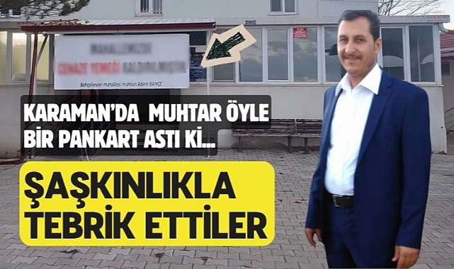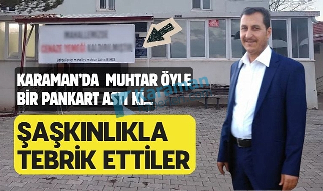 Karaman Bahçelievler Mahallesi'nde muhtar Adem Bahçe'nin Hz. Mevlana Cami girişine astığı pankart ile cenaze yemeğinin mahallede kaldırıldığı duyuruldu.Karaman’ın Bahçelievler Mahallesi’nde, uzun süredir kamuoyunda tartışılan cenaze yemeği geleneği ile ilgili önemli bir karar alındı. Mahalle Muhtarı Adem Bahçe, Hz. Mevlana Camii girişine astırdığı pankartla, mahalle genelinde cenaze yemeği uygulamasının kaldırıldığını duyurdu.