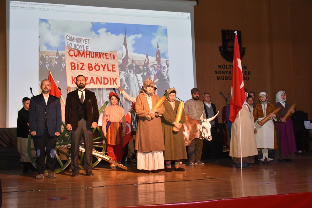 İl Millî Eğitim Müdürü Mehmet Çalışkan'ın konuşmasının ardından sahne alan Karaman Özel Eğitim Uygulama Okulu öğrenci velilerinden Gül Yeniad’ın oğlu Mehmet Akif için yazmış olduğu ‘Anladım ki Anne Olmak’ isimli şiiri okuması salonda duygu dolu anlar yaşattı. Okunan şiir sonrasında Karaman Özel Eğitim Uygulama Okulu öğretmen ve öğrencilerince hazırlanan Cumhuriyet’imizin 100. yılına özel tablo canlandırma gösterisi ve Karaman Özel Eğitim Anaokulunun minik öğrencilerinin sergilemiş olduğu dans gösterisi davetliler tarafından ilgiliyle izlenirken Karaman Özel Eğitim Meslek Okulu öğrencilerinin oluşturduğu Türk Halk Müziği Korosu’nun müzik dinletisi kulakların pasını sildi. Karaman Özel Eğitim Meslek Okulu öğrencilerinin hazırlamış olduğu zeybek ve seymen gösterisiyle devam eden programda, Karaman Özel Eğitim Uygulama Okulu öğrencilerinin hünerlerini sergilediği yıldızlar geçidi ve palyaço gösterisi izleyicilere neşeli dakikalar yaşattı. Alkışlarıyla öğrencilere tempo tutan veliler bu güzel anları cep telefonlarıyla çektikleri fotoğraflar ve kaydettikleri videolarla ölümsüzleştirdiler.Program, Karaman Özel Eğitim Uygulama Okulu öğrencilerinin değme oyunculara taş çıkartarak sahnelediği “Acil Hasta Var’ isimli oyunu ile devam etti. Programın son bölümünde tüm öğretmen, öğrenciler ve veliler sahneye çıkarken ‘Bu Ne Dünya Kardeşim’ şarkısını hep birlikte söyleyerek gönüllerince eğlendiler. Bu güzel ana protokol üyeleri de alkışlarla tempo tutarak eşlik ettiler.Program, günün anısına çekilen fotoğraflarla sona erdi.