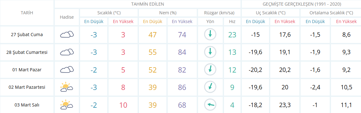 Cuma günü de kar yağışının etkisini sürdürmesi beklenirken, 1 Mart 2026 itibarıyla yağışlı sistemin bölgeyi terk ederek yerini soğuk fakat yağışsız bir hava kütlesine bırakacağı tahmin ediliyor. Ancak soğuk hava etkisini artırarak devam edecek.