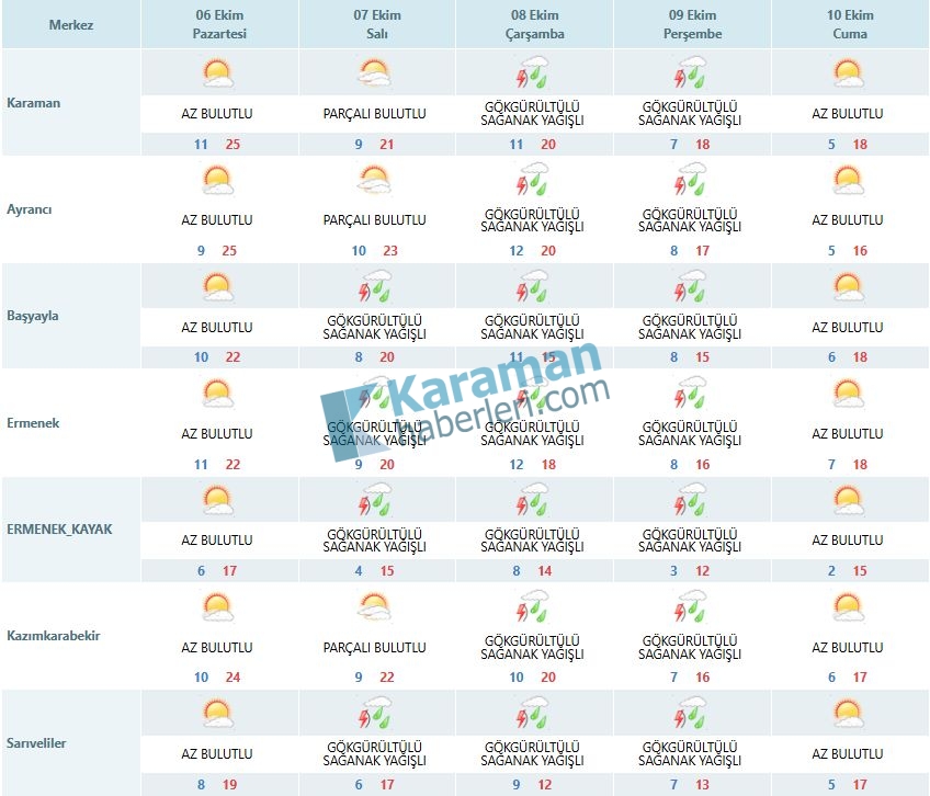 Karaman'da son günlerde havaların iyice soğuması şehirde yağış beklentisini yükseltti.Meteoroloji Genel Müdürlüğü Karaman için kritik uyarılarda bulunurken, hafta içinde sağanak yağışların etkili olacağını aktardı.Yeni haftaya güneşli başlayan şehirde Çaraşmba ve perşembe günleri sağanak yağmurun etkili olacağı aktarılırken cuma günü ise hava sıcaklığının son zamanların en düşük seviyesi olan 5 dereceyi göreceği tahmin edildi.Karaman'da hava durumu ve hava sıcaklığı şu şekilde olacak;