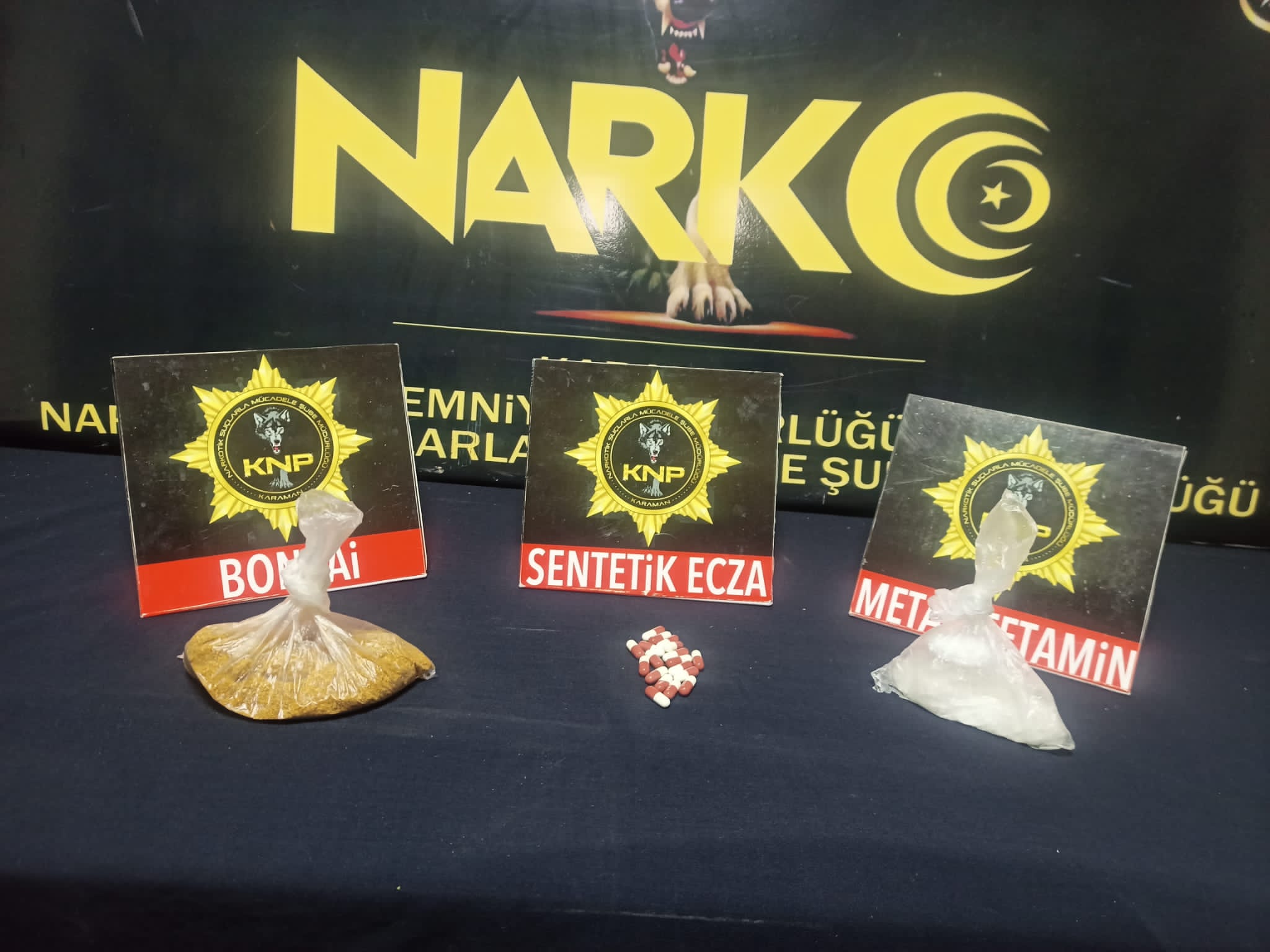 Karaman - Ereğli yolu üzerinde şüphe üzerine durdurulan araçta yapılan kontrollerde, aranan M.A.N. ve B.N. isimli şahıslara ait yüklü miktarda uyuşturucu madde ele geçirildi.Yapılan aramada 80.67 gram bonzai, 46.20 gram metamfetamin ve 19 adet sentetik ecza maddesi bulundu.Gözaltına alınan şüpheliler, bugün sağlık kontrolünün ardından mahkemeye sevk edildi.Şüpheliler, çıkarıldıklarını mahkeme tarafından tutuklanarak cezaevine gönderildi.