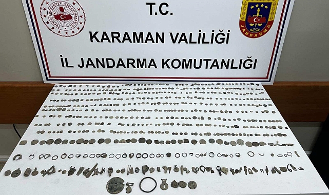Karaman İl Jandarma Komutanlığı Kaçakçılık ve Organize Şube Müdürlüğü ve Merkez İlçe Jandarma Komutanlığı Yeşildere Jandarma Karakol Komutanlığı tarafından Kaçakçılıkla Mücadele faaliyetleri kapsamında yapılan çalışmalar sonucunda, satmak amacıyla evlerinde tarihi eser bulundurduğu tespit edilen O.Ö ve İ,Ö isimli şahısların Yeşildere Köyünde bulunan evlerinde yapılan arama sonucunda; 515 adet sikke, 100 adet obje olmak üzere toplam 615 adet tarihi eser olduğu değerlendirilen eski eser geçirildi.Yakalanan şahıslarla ilgili adli işlemlere devam edildiği bilgisine ulaşılırken, Karaman'da vatandaşların huzur ve güven ortamının devamını sağlamaya yönelik denetim ve uygulamalara, her türlü kaçakçılıkla mücadele faaliyetlerine kararlı ve kesintisiz bir şekilde devam edileceği bildirildi.