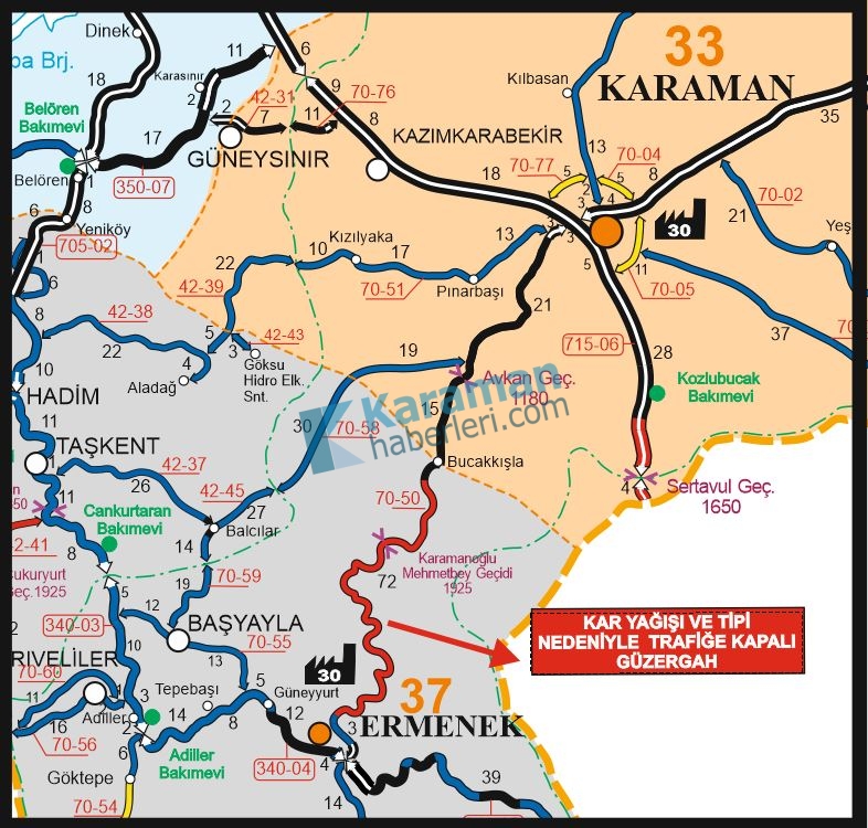 Karaman’da etkili olan yoğun kar yağışı ve tipi, ulaşımda aksamalara yol açtı. Özellikle yüksek kesimlerde etkisini artıran olumsuz hava koşulları nedeniyle 70-50 Karayolu’nun Ermenek–Bucakkışla yolu trafiğe kapatıldı.