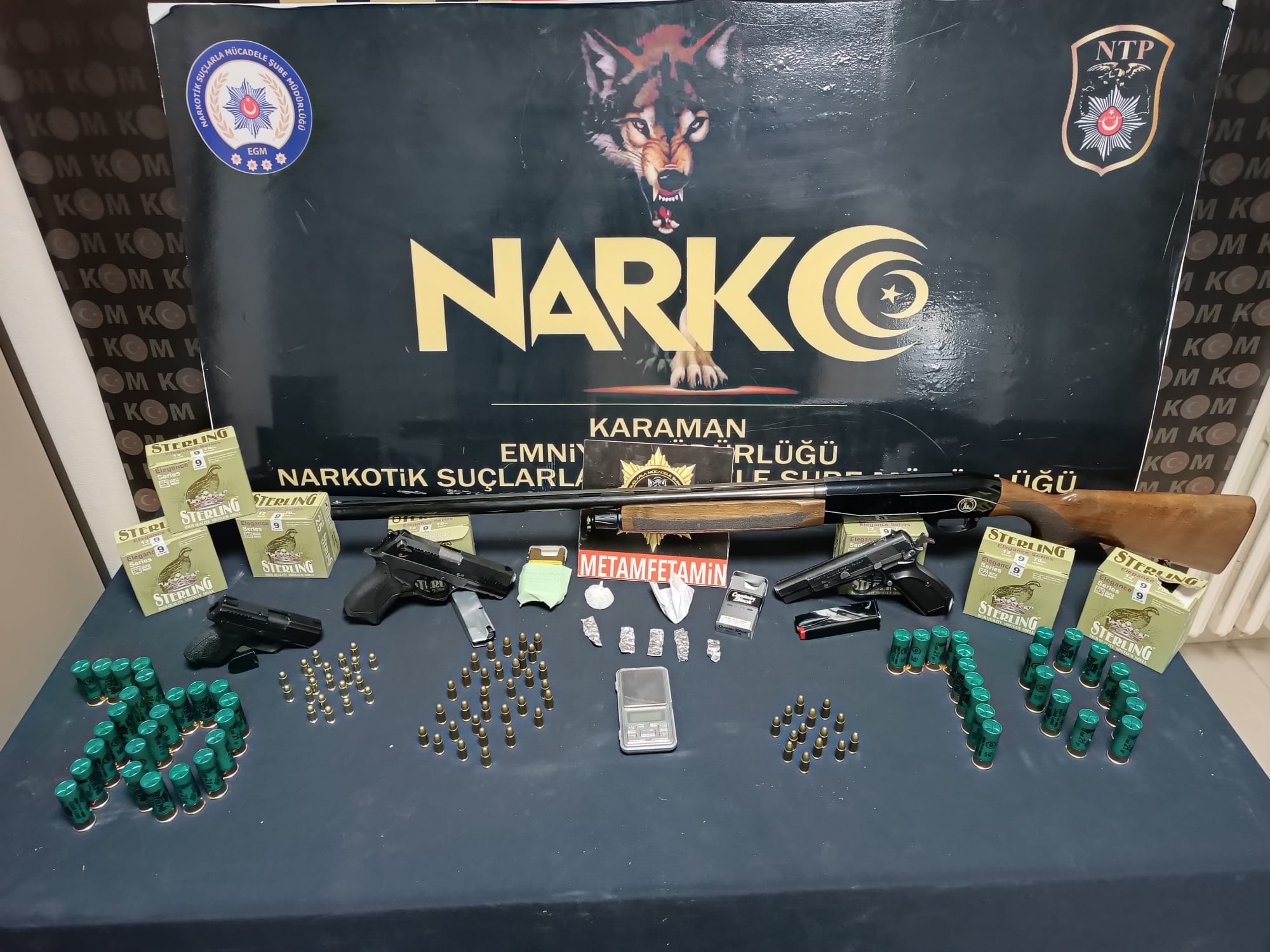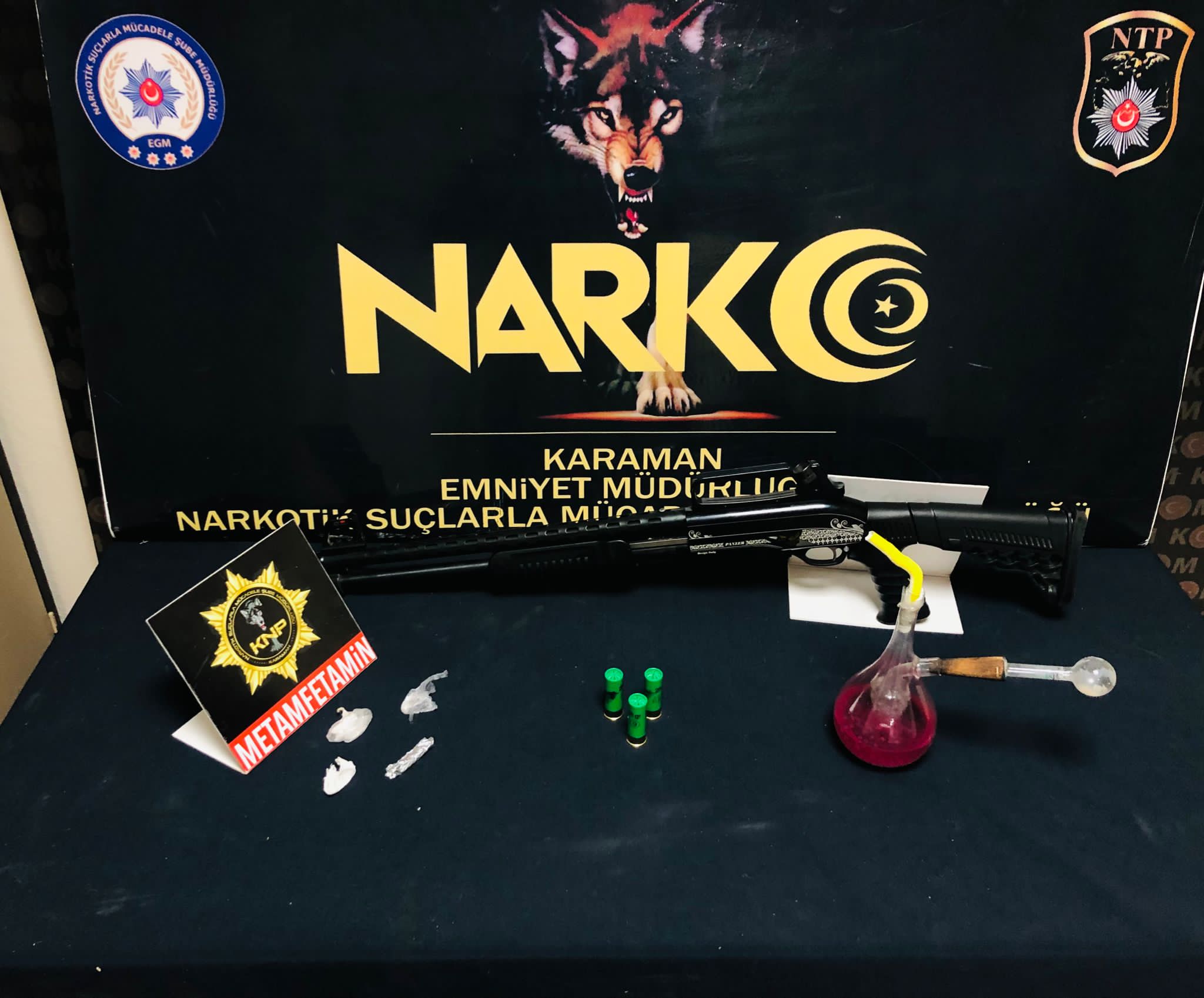 Karaman'da Emniyet Müdürlüğü'ne bağlı Narkotik Suçlarla Mücadele Şubesi'nin çalışmaları neticesinde uyuşturucu ticareti yaptığı ileri sürülen 3 şüpheli yakalanarak gözaltına alındı.Edinilen bilgilere göre Karaman'da uyuşturucu ticareti yaptığı bilgisi edinilmesi üzerine Karaman Emniyet Müdürlüğü Narkotik Suçlarla Mücadele ekipleri Cumhuriyet Başsavcılığı'nın talimatı üzerine adreslere baskın yaptı. Düzenlenen baskında R.Ç., İ.K., S.A. isimli 3 şüpheli yakalanarak gözaltına alındı.Şüphelilere yönelik yapılan aramalarda, 24.86 gram metamfetamin, 4 adet tabanca, 1 adet pompalı tüfek, 71 adet fişek ve 1 adet hassas terazi ele geçirildi.Emniyetteki işlemleri tamamlanan şüpheliler mahkemeye çıkarılmak üzere Karaman Adliyesi'ne sevk edildi. 3 şahıs da tutuklanarak cezaevine gönderildi.