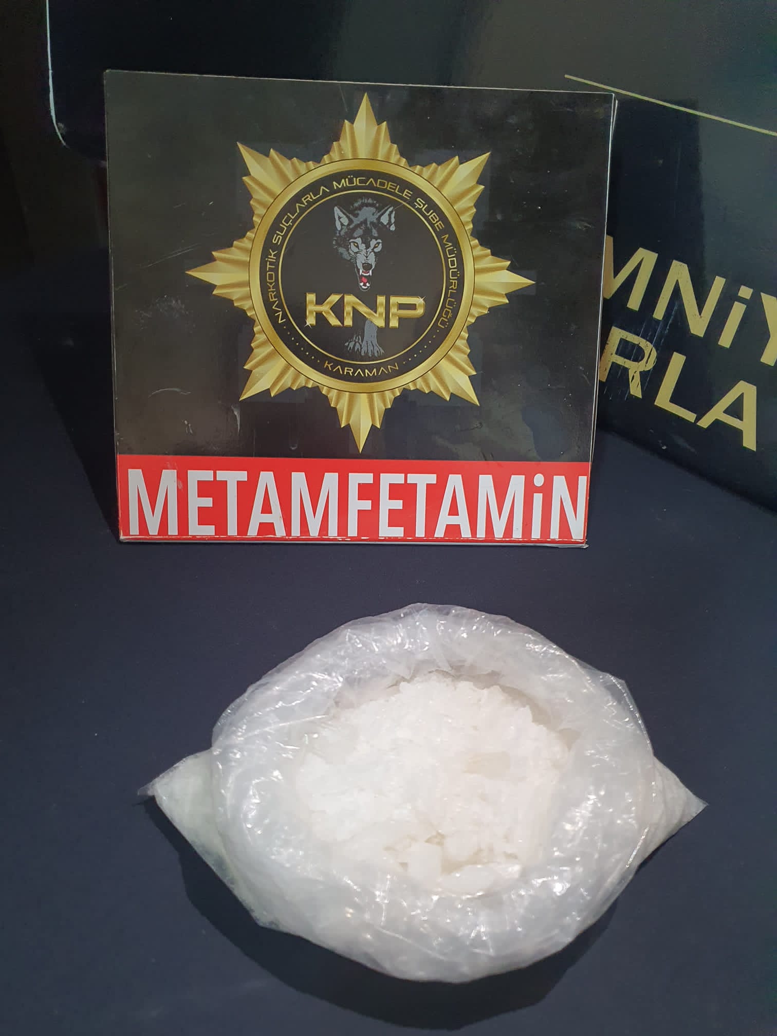 Karaman Emniyet Müdürlüğü Narkotik Şube ekiplerince yürütülen çalışmalar neticesinde, Karaman'a uyuşturucu madde getireceği bilgisi alınan U.K. ve İ.Ş. isimli şahıslar yakalanarak gözaltına alındı.Şahıslara yönelik yapılan aramalarda 202 gram metamfetamin maddesi ele geçirildi. Şahıslar emniyetteki işlemlerinin tamamlanmasının ardından adliyeye sevk edilerek hakim karşısına çıkartıldı. Her iki şahıs da tutuklanarak cezaevine gönderildi.