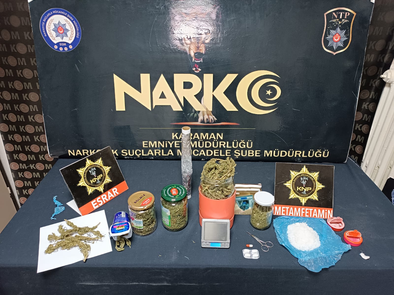 Karaman Emniyet Müdürlüğü'ne bağlı Narkotik Suçlarla Mücadele Şubesi'nin uyuşturucu ticareti yapmak suçundan sokak satıcılarına yönelik çalışmalarında, 3 şüpheli gözaltına alındı.Gözaltına alınan R.C., D.E. ve İ.E.Ç. isimli şüphelilere yönelik yapılan ikamet ve üst aramalarında 102,60 Gr metamfetamin, 1710 gram esrar, 290 adet entetik ecza maddesi, 1 adet hassas terazi ele geçirildi.Emniyetteki işlemlerinin tamamlanmasının ardından Karaman Adliyesi'ne sevk edilen şüphelilerde R.C. ile D.E. çıkarıldıkları mahkeme tarafından tutuklanırken, İ.E.Ç. ise adli kontrol şartıyla serbest bırakıldı.