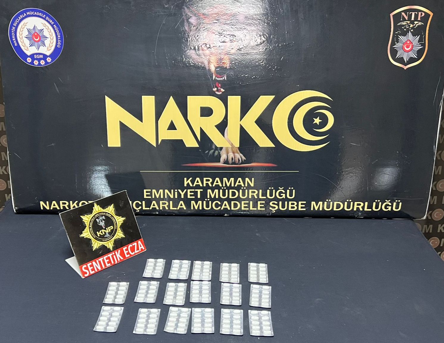 Karaman Emniyet Müdürlüğü Narkotik Şube ekiplerince yürütülen çalışmalar neticesinde, uyuşturucu ticareti yaptıkları ileri sürülen S.A., C.A.C. ve H.Y. isimli 3 şüpheli hakkında çalışma başlatıldı.Polisin çalışmaları sonucunda gözaltına alınan şüphelilerden 648 adet sentetik ecza hapı ele geçirildi. Şüpheliler emniyetteki işlemlerinin ardından adliyeye sevk edildi.3 şüpheli de çıkarıldıkları mahkeme tarafından tutuklanarak cezaevine gönderildi.