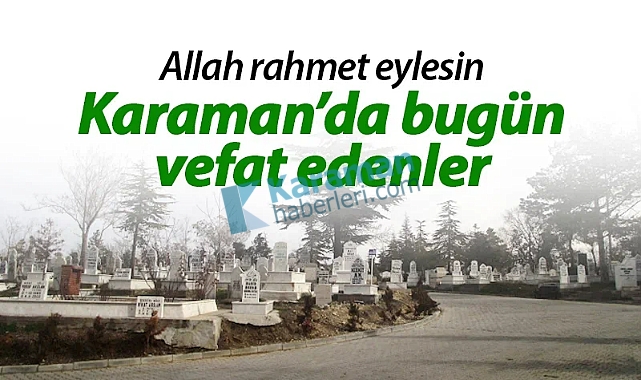 Aslen Barutkavran köyünden olup Alaçatı köyünde ikamet etmekte olan REMZİ ÖZASLAN (61) vefat etmiştir. Cenazesi 27 Nisan Pazartesi günü öğle namazına müteakip musalladan kaldırıldı.DEFİN YERİ: KARAMAN MERKEZ ŞEHİR MEZARLIĞI - Ada No: 1Aslen Karamanlı olup Gökçe köyünde ikamet etmekte olan MEHMET LÖK (28) vefat etmiştir. Cenazesi 27 Nisan Pazartesi günü öğle namazına müteakip musalladan kaldırıldı.DEFİN YERİ: KARAMAN MERKEZ ŞEHİR MEZARLIĞI - Ada No: 25Aslen Kızılyaka köyünden olup İmaret mahallesimde ikamet etmekte olan ALİ RIZA GÜLER (87) vefat etmiştir. Cenazesi 27 Nisan Pazartesi günü öğle namazına müteakip musalladan kaldırıldı.DEFİN YERİ: KARAMAN MERKEZ ŞEHİR MEZARLIĞI - Ada No: 104Aslen Karamanlı olup Mümine Hatun mahallesinde ikamet etmekte olan EMRULLAH YARAR (57) vefat etmiştir. Cenazesi 27 Nisan Pazartesi günü ikindi namazına müteakip Siyahser mezarlığından kaldırılacaktır.DEFİN YERİ: KARAMAN MERKEZ SİYAHSER MEZARLIĞI - Ada No: 2Karamanhaberleri.com ailesi olarak merhuma Allah'tan rahmet, kederli ailesine ve yakınlarına başsağlığı dileriz.