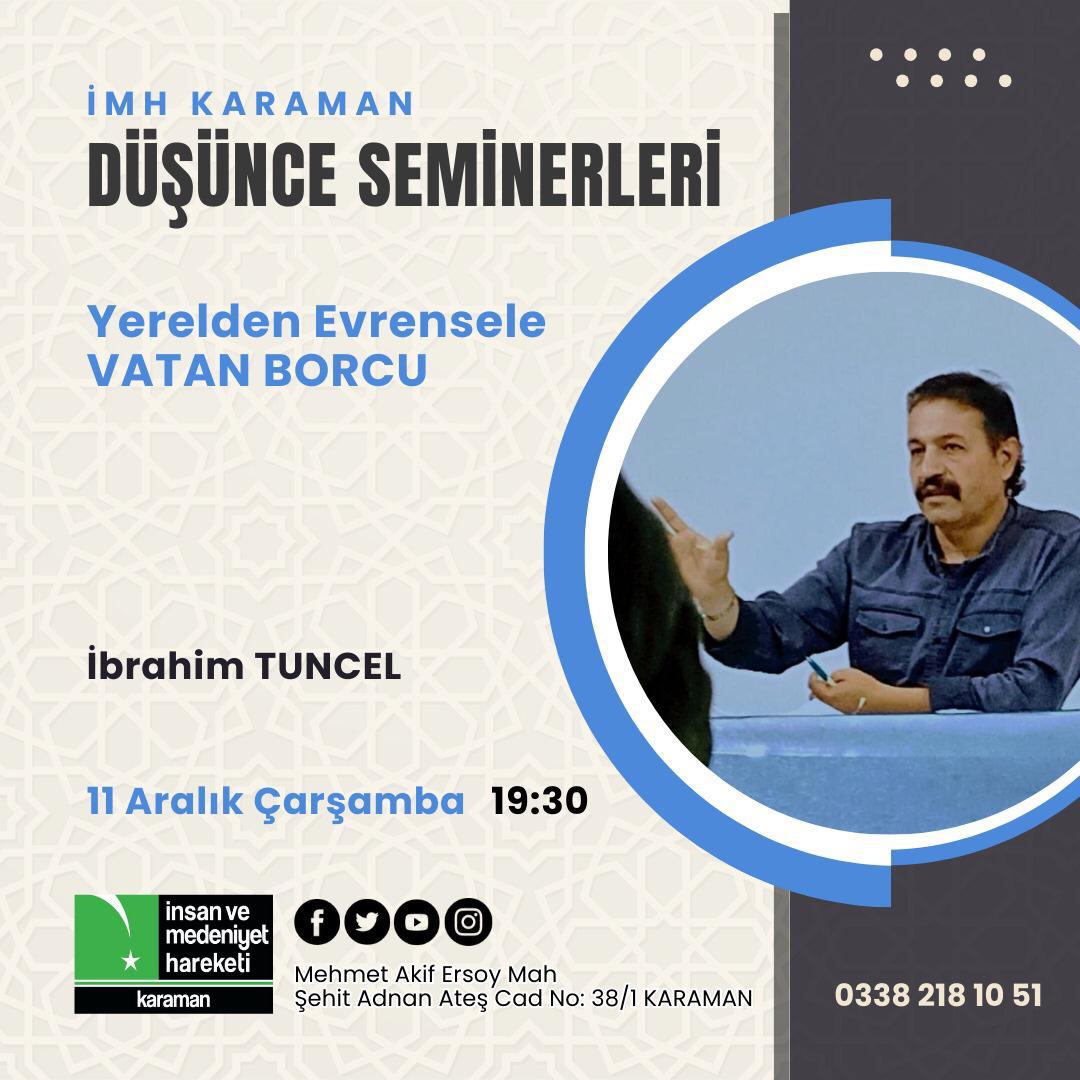 İnsan ve Medeniyet Hareketi Karaman Şubesi tarafından düzenlenen Düşünce Seminerleri, toplumsal, kültürel ve evrensel konularda farkındalık yaratmayı amaçlıyor. Bu kapsamda gerçekleştirilecek seminer, vatan borcunun yerelden evrensele uzanan boyutlarını irdeleyerek Karaman halkını önemli bir tartışmaya davet ediyor.Etkinlik Herkese Açık ve Ücretsiz