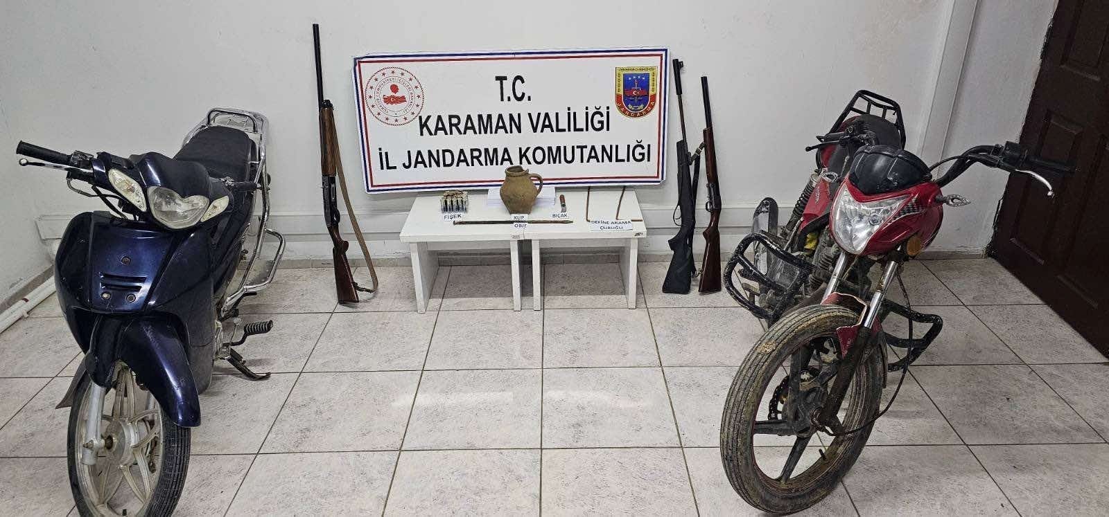 Denetimler esnasında ayrıca; (4) adet Ruhsatsız Av Tüfeği, (4) adet Şarjör, (30) adet Fişek, (2) adet Şase Motor Numarası Kazınmış Çalıntı olduğu değerlendirilen Motosiklet, (1) adet Küp (Roma Dönemi), (1) adet Obje (Roma Dönemi), Define Arama Çubuğu ve Bıçak ele geçirildi.İlimizde huzur ve güven ortamının devamını sağlamaya yönelik denetim ve uygulamalara kararlı ve kesintisiz bir şekilde devam edileceği öğrenildi.