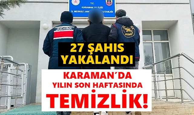 Karaman'da yılın son haftasına girilirken şehirde huzur ve güvenliği bozan şahısları yakaladı. Yakalanan 27 kişiden 8'i tutuklandı.Karaman İl Jandarma Komutanlığınca asayiş, narkotik ve trafik olayları başta olmak üzere, vatandaşımızın huzurunu bozacak her türlü suçun önlenmesi, suça karışan şahısların yakalanması amacıyla 20-26 Aralık 2024 tarihleri arasında operasyonlar yaptı. Yapılan çalışmalarda; 10.939) şahıs ve (3.572) araç sorgulandı.JANDARMA DEDEKTİFLERİ (JASATLAR) başta olmak üzere asayiş ekiplerince yapılan çalışmalar neticesinde; Kasten Yaralama, Silahla Tehdit, Basit Yaralama, Herkesin Girebileceği Bir Yerde Bırakılmakla Birlikte Kilitlenmek Suretiyle Hırsızlık, Kullanmak İçin Uyuşturucu ve Uyarıcı Madde Satın Almak, Kabul Etmek Bulundurmak ve Kullanmak, Uyuşturucu veya Uyarıcı Madde Ticareti Yapma veya Sağlama, Trafik Güvenliğini Tehlikeye Sokma suçlarından aranan (27) şahıs yakalanıp, (8) şahıs tutuklanıp, (10) araç sürücüsüne ehliyetsiz/yetersiz araç kullanmaktan, (7) araç trafikten men edildi.