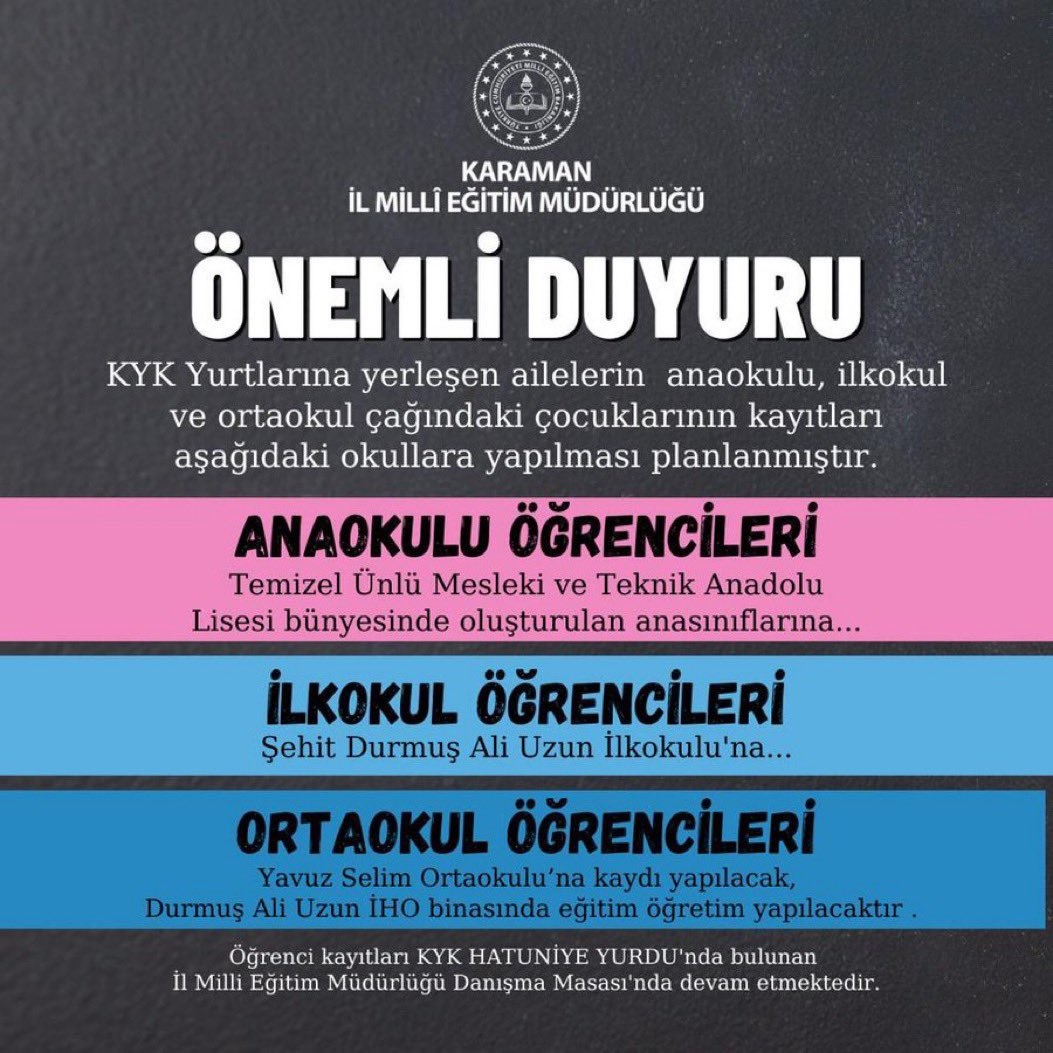 Karaman Valiliği koordinesinde Karaman’a şehirlerarası otobüs ve kendi özel araçlarıyla şuana kadar gelen 3 bin 409 depremzede vatandaş Hamidiye Mahallesi’nde bulunan GSB’ye ait kız ve erkek öğrenci yurtlarına yerleştirildi.Karaman Milli Eğitim Müdürlüğü, KYK yurtlarına yerleştirilen ailelerin anaokulu ve ortaokul çağındaki çocuklarını hangi okullara kayıt ettirebileceğini açıkladı.Yapılan duyuruya göre;Anaokulu öğrencileri, Temizel Ünlü Mesleki ve Teknik Anadolu Lisesi bünyesindeki anasıflarına,İlkokul öğrencileri, Şehit Durmuş Ali Uzun İlkokulu'na,Ortaokul öğrencileri de Yavuz Selim Ortaokulu'na kayıt edilecek. Ortaokul öğrencileri Durmuş Ali Uzun İHO binasında eğitim öğretim görecek.Öğrenci kayıtları KYK Hatuniye Yurdunda bulunan İl Milli Eğitim Müdürlüğü Danışma Masasında devam ediyor.