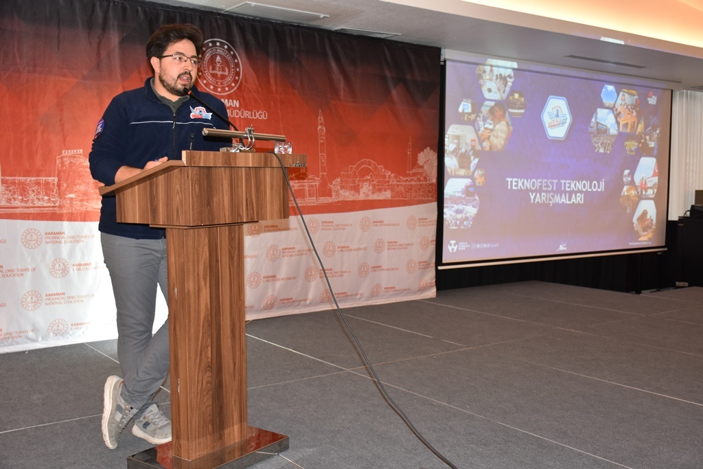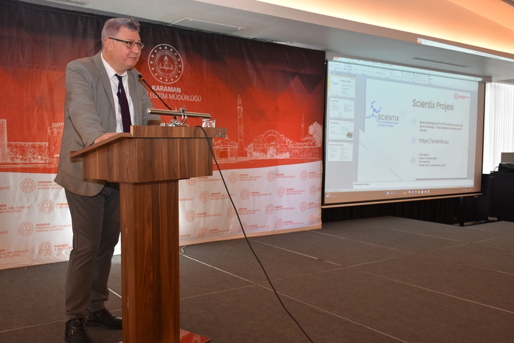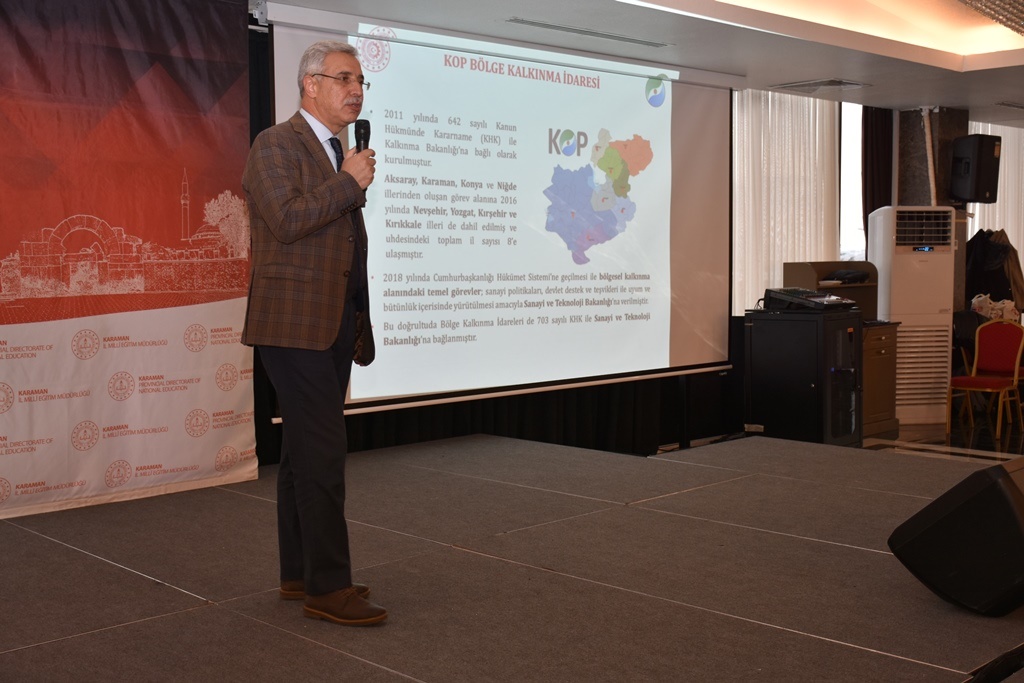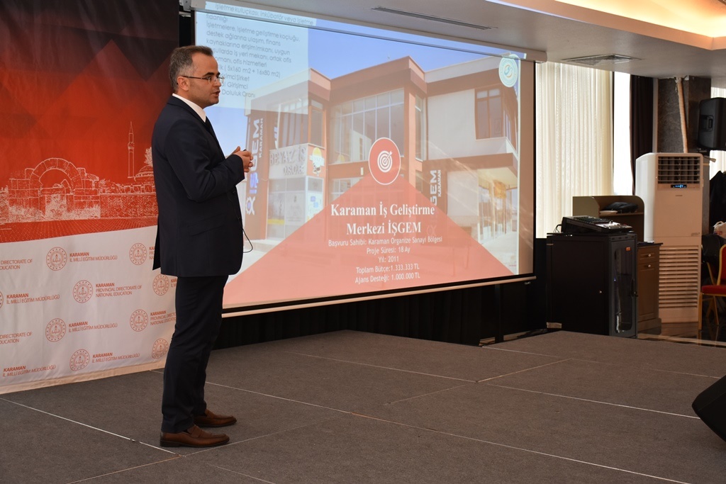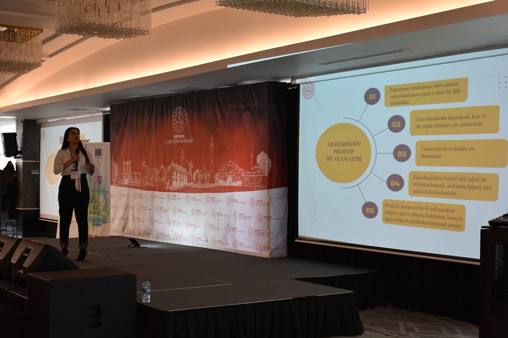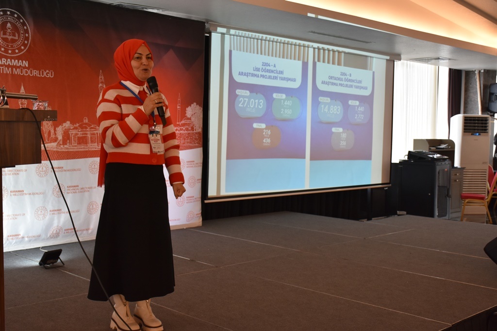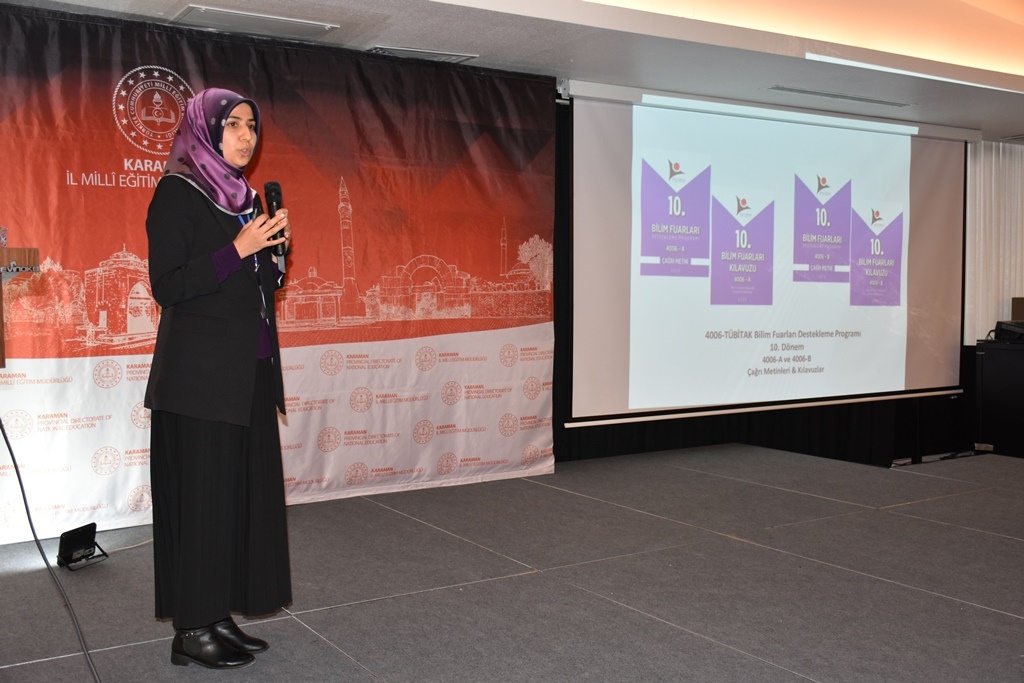 Program, Karaman Bilim ve Sanat Merkezi öğrencilerine danışmanlık yapan Kimya Öğretmeni Goncagül Balasar’ın TÜBİTAK tarafından bu yıl 17'ncisi düzenlenen 2204-B Ortaokul Öğrencileri Araştırma Projeleri Yarışmasında Biyoloji alanında ortaya koymuş oldukları "Elma Posası İlave Edilerek Üretilen Köftenin Kalite Özelliklerinin Belirlenmesi" isimli proje ile 14 Bin 883 proje arasında Türkiye 2'incisi olunmasının başarı hikâyesini anlatmasıyla devam etti.Çalıştayda, İl Milli Eğitim Müdürlüğü AR-GE birimi personellerinden Gülfem Aday Korkmaz, Bilimsel Makale ve Rapor Yazımı konusunu ele alırken Fatih Bircan ise Sınai Mülkiyet Hakları konusu hakkında eğitimcilere bilgiler verdi. Mevlana Kalkınma Ajansı Uzmanları Selim Gülhan ile Gürbüz Çoban’ın Mevlana Kalkınma Ajansı Projelerine ilişkin yaptığı sunum ile devam çalıştayda, Konya Ovası Projesi Temsilcisi Ümit Yorgancılar, Konya Ovası Projeleri’ni anlatırken T3 Vakfı (Türkiye Teknoloji Takımı Vakfı) Karaman İl Sorumlusu Hasan Şenyürek’de TEKNOFEST konusunda merak edilen sorulara yanıt verdi. Proje Bilgilendirme Çalıştay’ın ilk günü Bayır Ortaokulu Fen Bilimleri Öğretmeni Muhsine Büşra Tuğcu ve İmaret Ortaokulu Fen Bilimleri Öğretmeni Kadir Yetiş’in TÜBİTAK 4006-4007 Projeleri bilgilendirme sunumu ile sona erdi. Çalıştayın ikinci günü İl Milli Eğitim Müdürlüğü AR-GE birimi personellerinden Tuba Karaer’in eTwinning konusuna ilişkin sunumu ile başladı. Ardından kürsüye gelen Millî Eğitim Bakanlığı Yenilik ve Eğitim Teknolojileri Genel Müdürlüğü eTwenning Türkiye Ulusal Destek Servisi İçerik ve Eğitim Sorumlusu Ertan Kocabaş, eTwinning konusunda öğretmenlerin kendine yöneltmiş olduğu soruları cevapladı. Ertan Kocabaş’ın ardından kürsüye gelen Milli Eğitim Bakanlığı Yenilik ve Eğitim Teknolojileri Genel Müdürlüğünden Dr. Tunç Erdal Akdur ve Akçaşehir Ortaokulu Fen Bilimleri Öğretmeni Betül Karabudak ise SCIENTIX konusuna ilişkin bilgileri katılımcılarla paylaştı.Çalıştayın son bölümünde Uzman Eğitmen, Proje Geliştirme ve Yönetimi Danışmanı Onur Çiftçi, Erasmus+ programlarına yönelik katılımcılara bilgiler aktarırken proje yazımının püf noktalarından ve yöntemlerinden bahsetti.Geniş bir katılımla gerçekleştirilen Proje Bilgilendirme Çalıştay’ı, İl Millî Eğitim Müdürü Mehmet Çalışkan, Hanımefendi Hatice Sarıibrahim ve İl Millî Eğitim Müdür Yardımcısı İsmail Kılınç’ın çalıştaya sunumları ile katkı sağlayan kişilere plaket vermesi ve günün anısına çekilen fotoğraflarla sona erdi.