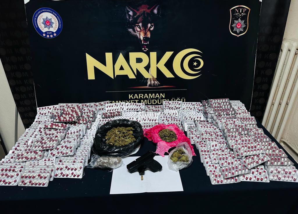 Karaman İl Emniyet Müdürlüğü Narkotik Suçlarla Mücadele Şubesi ekiplerinin çalışmaları neticesinde, Karaman'a getirileceği öğrenilen yüklü miktardaki uyuşturucu için çalışma başlatıldı.Polis ekipleri, uyuşturucu madde getirileceği bilgisi üzerine çok sayıda araç ve ikamete operasyon düzenledi. Operasyon sonucunda C.B., M.K. ve M.O. isimli şahıslar yakalandı. Şahısların kullanımında bulunan 3 ayrı araçta ve ikametlerinde yapılan aramalarda 5138 adet uyuşturucu hap, 381,3 gr Skunk, 4 kök kenevir bitkisi, 1 adet hassas terazi ve 1 adet ruhsatsız tabanca ele geçirildi.Yakalanan şüpheliler emniyetteki işlemlerinin ardından adliyeye sevk edildi. Şüpheliler, çıkarıldıkları mahkeme tarafından tutuklanarak cezaevine gönderildi.