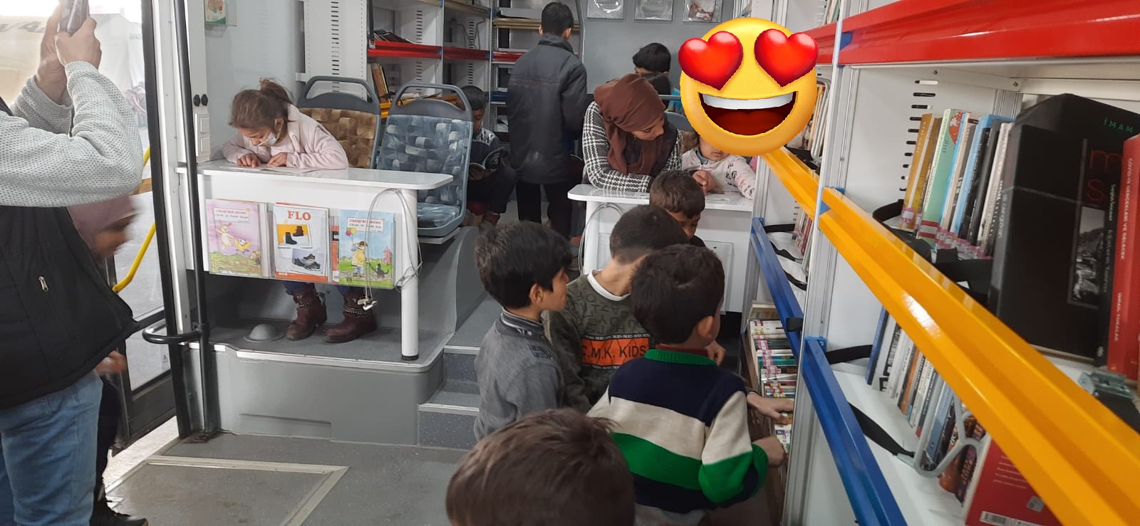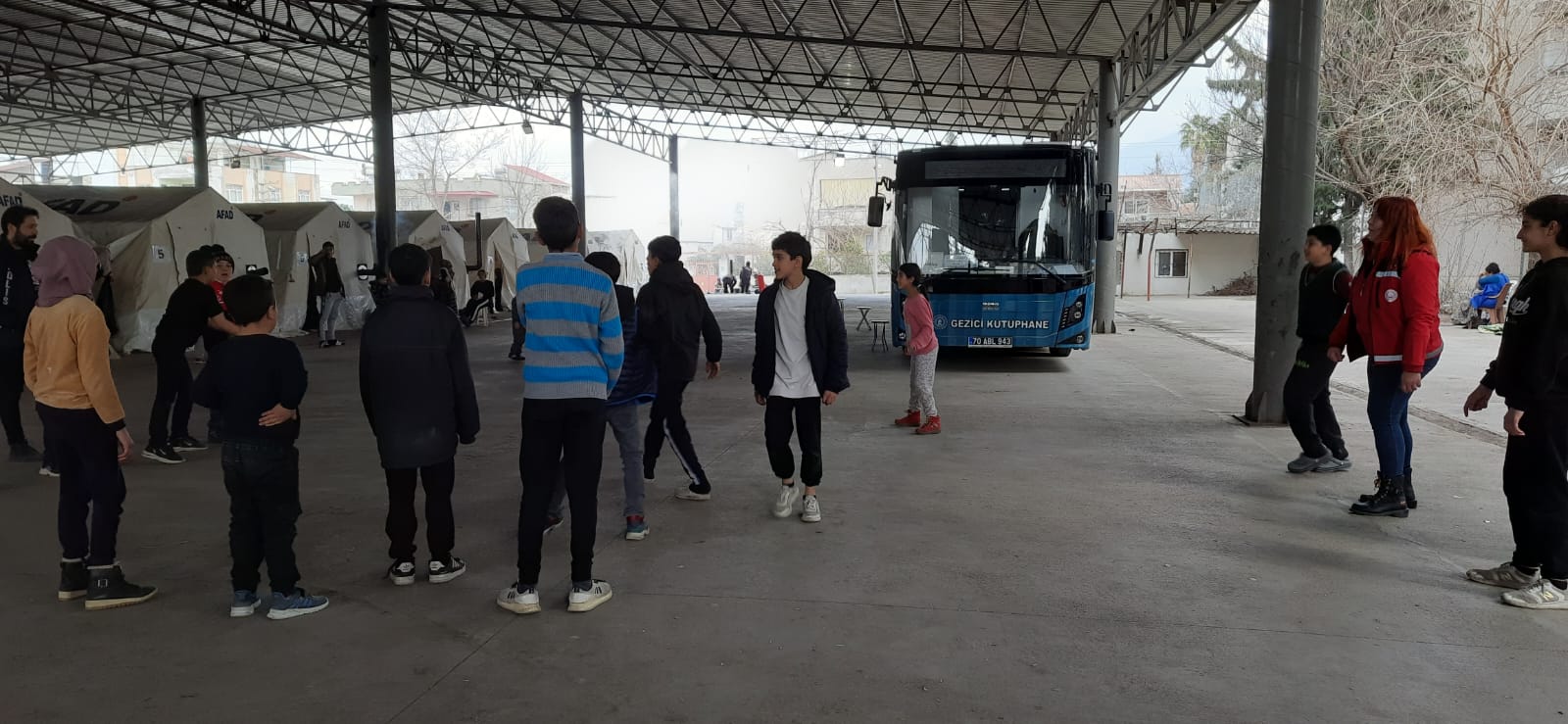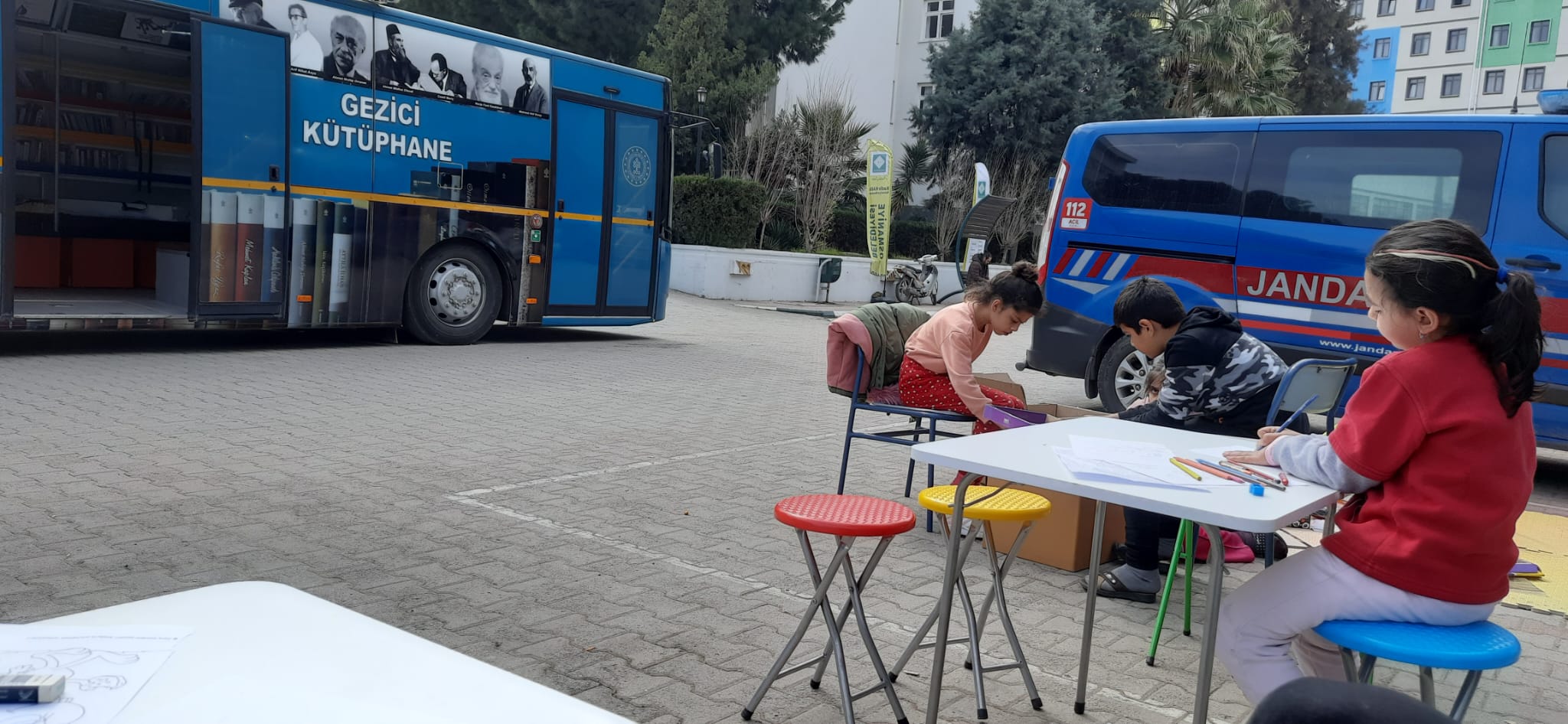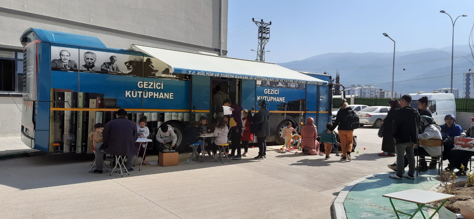 Kültür ve Turizm Bakanlığı koordinesinde Karamanoğlu Mehmetbey İl Halk Kütüphanesi Müdürlüğü hizmetinde kullanılan gezici kütüphane Osmaniye'de depremzede çocuklarla buluştu.