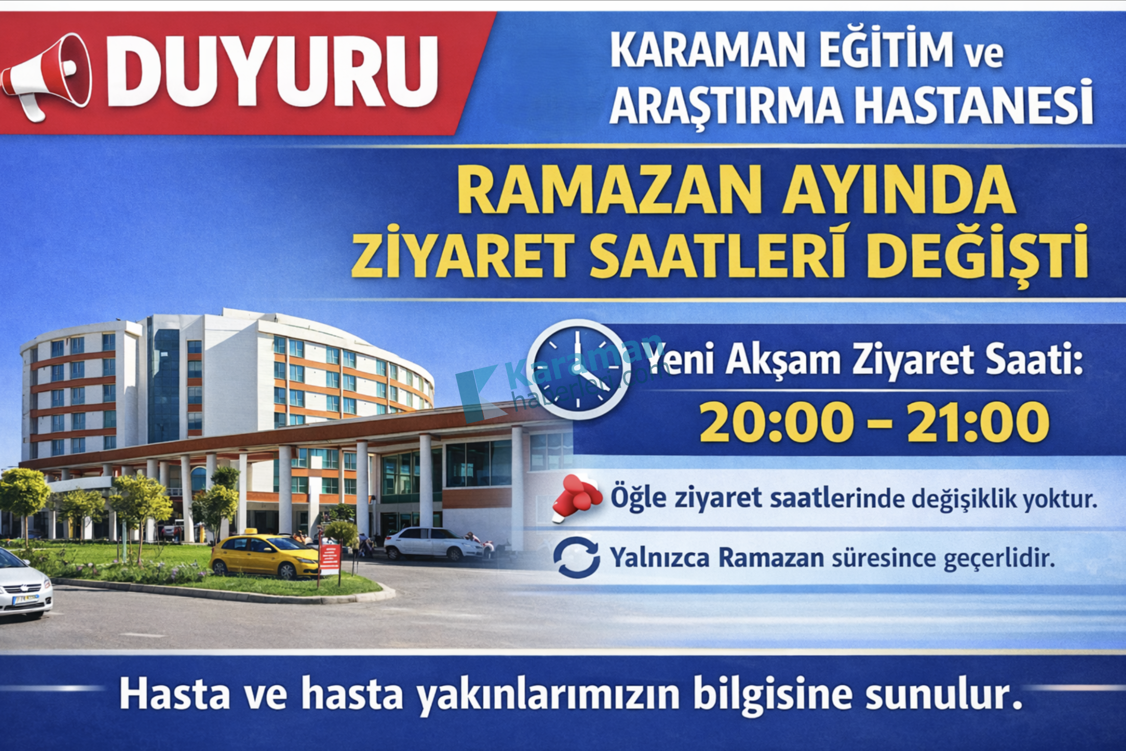 Karaman’da hizmet veren Karaman Eğitim ve Araştırma Hastanesi, Ramazan ayının başlamasıyla birlikte hasta ziyaret saatlerinde önemli bir değişikliğe gitti. İftar vaktiyle çakışan akşam ziyaretleri, hasta yakınlarının ibadetlerini rahatça yerine getirebilmesi ve ziyaretlerini daha sağlıklı planlayabilmesi amacıyla yeniden düzenlendi.