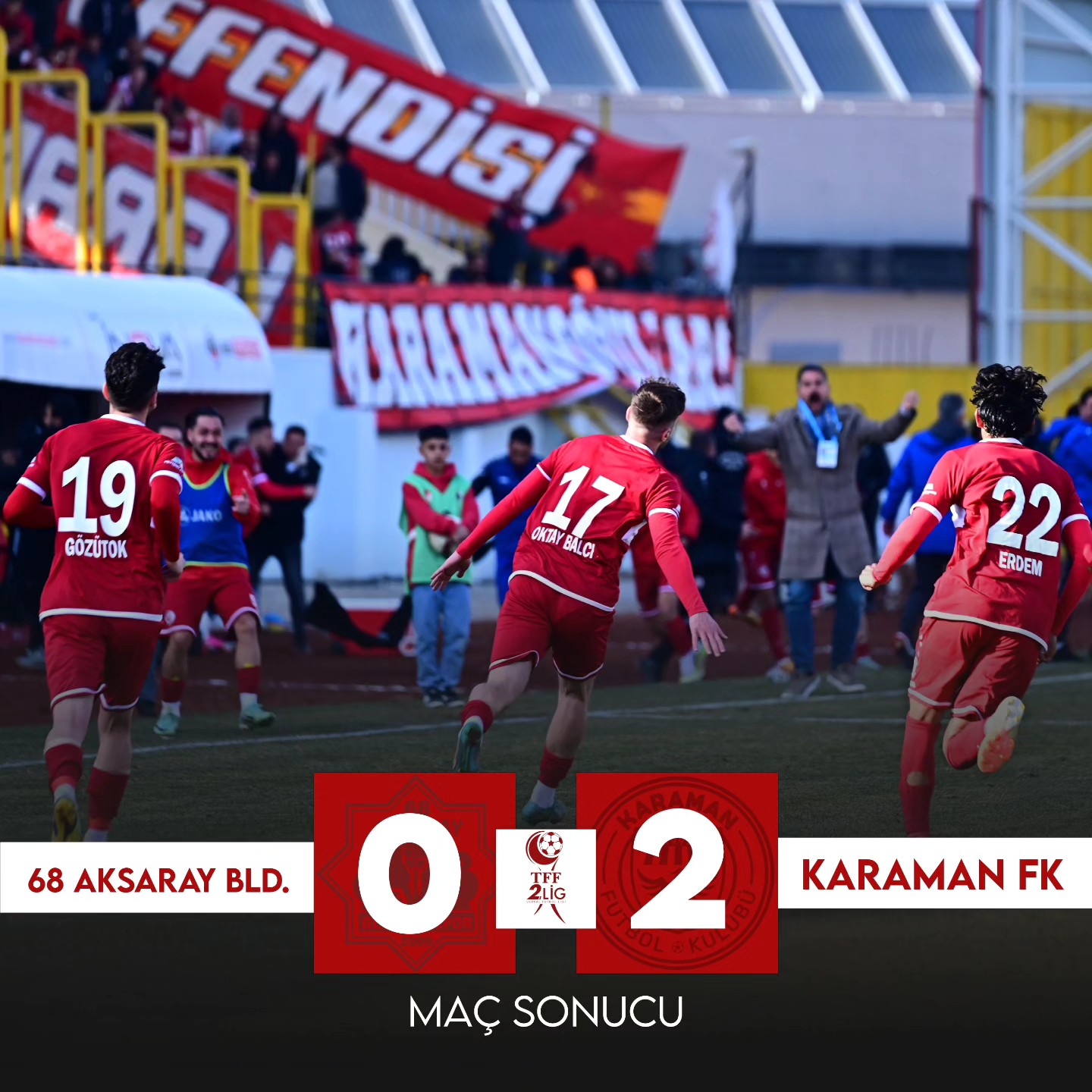 TFF 2. Lig Kırmızı Grup'ta 23. maçını oynayan Karaman FK, 68 Aksaray Belediyespor'a konuk oldu. Dağılgan Stadyumunda saat 14:00'te başlayan mücadeleyi Burak Demirkan yönetti.Ligde kendi evinde farklı bir oyun sergileyerek puanları toplayan fakat deplasmanlarda istediği sonuçlara ulaşamayan Karaman FK, bu kez 0-2'lik net bir skor ile Aksaray deplasmanında 3 puanı kazanan taraf oldu.Karaman FK'nın gollerini, 40. dakikada Anık Gözütok ile 80. dakikada Oktay Balcı kaydetti.Karaman FK, ligde haftanın tüm maçlarının oynanmadığı mevcut durumda 31 puan ile 9. sıraya yerleşti.Karaman FK, bir sonraki lig maçında 11 Şubat 2024 tarihinde saat 14:00'te Karaman Şehir Stadyumunda oynanacak mücadelede İskenderunspor ile karşılaşacak.