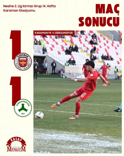 Türkiye Nesine 2. Lig Kırmızı Grup'un 14. hafta mücadelesinde Karaman Futbol Kulübü, ev sahipliği yaptı. Yeni Karaman Stadyumunda saat 14:00'te başlayan mücadeleyi orta hakem G. Özbalkanlı yönetti.Maça yavaş başlayan temsilcimiz Karaman FK, ilk yarıda 38. dakikada Alperen Köşker'in attığı gol ile 1-0 geriye düştük.İkinci yarıda performansını sürdüren Karaman FK, Giresunspor'a gol fırsatı vermezken 64. dakikada Resul Türkkalesi attığı gol ile skoru eşitledi.Maç 1-1 beraberlikle biten Karaman FK, ligde puanını 18'de koruyarak dokuzuncu sırada kaldı.Karaman FK, bir sonraki lig maçını 8 Aralık tarihinde deplasmanda, Bld. Derincespor'a karşı oynayacak.