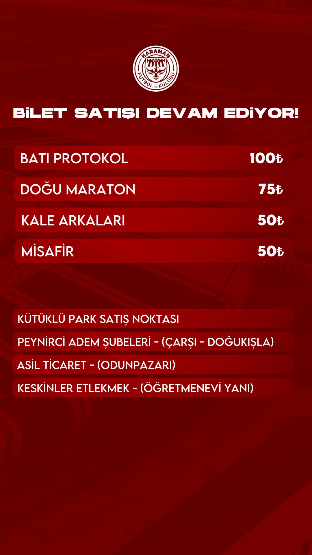Nesine 2. Lig Kırmızı grupta 20. Hafta maçında Motolux 68 Aksarayspor ile karşılaşacak olan temsilcimiz Karaman Futbol Kulübü’ne tribünde destek olmak için stadyuma gelecek olan taraftarların alacağı bilet fiyatları belli oldu.