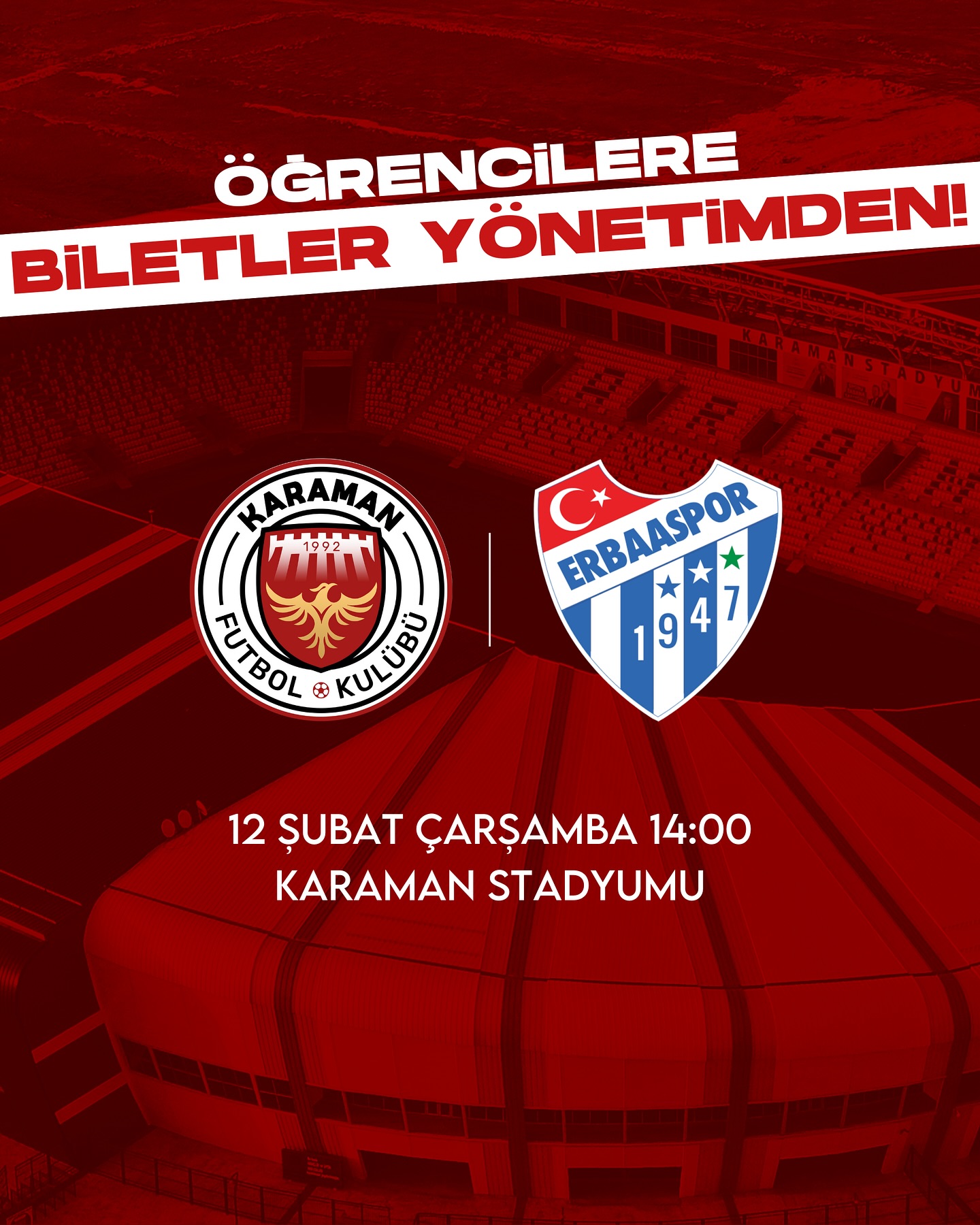 Bu önemli maçta Karaman FK’ya destek olmak isteyen öğrenciler, ücretsiz biletlerden faydalanarak takımına tribünden güç verebilir. Karaman Stadyumu’nda büyük bir atmosferin oluşması için tüm futbolseverler maça davet ediliyor.