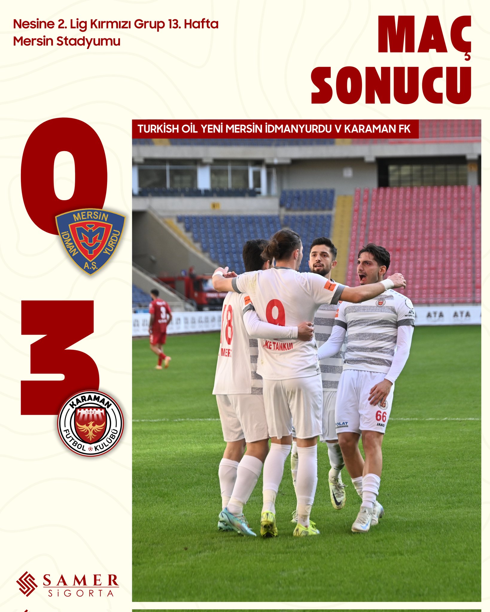 2. Lig Kırmızı Grup mücadelesinde Mersin'e konuk olan temsilcimiz Karaman FK, maçı 0-3 kazandı.