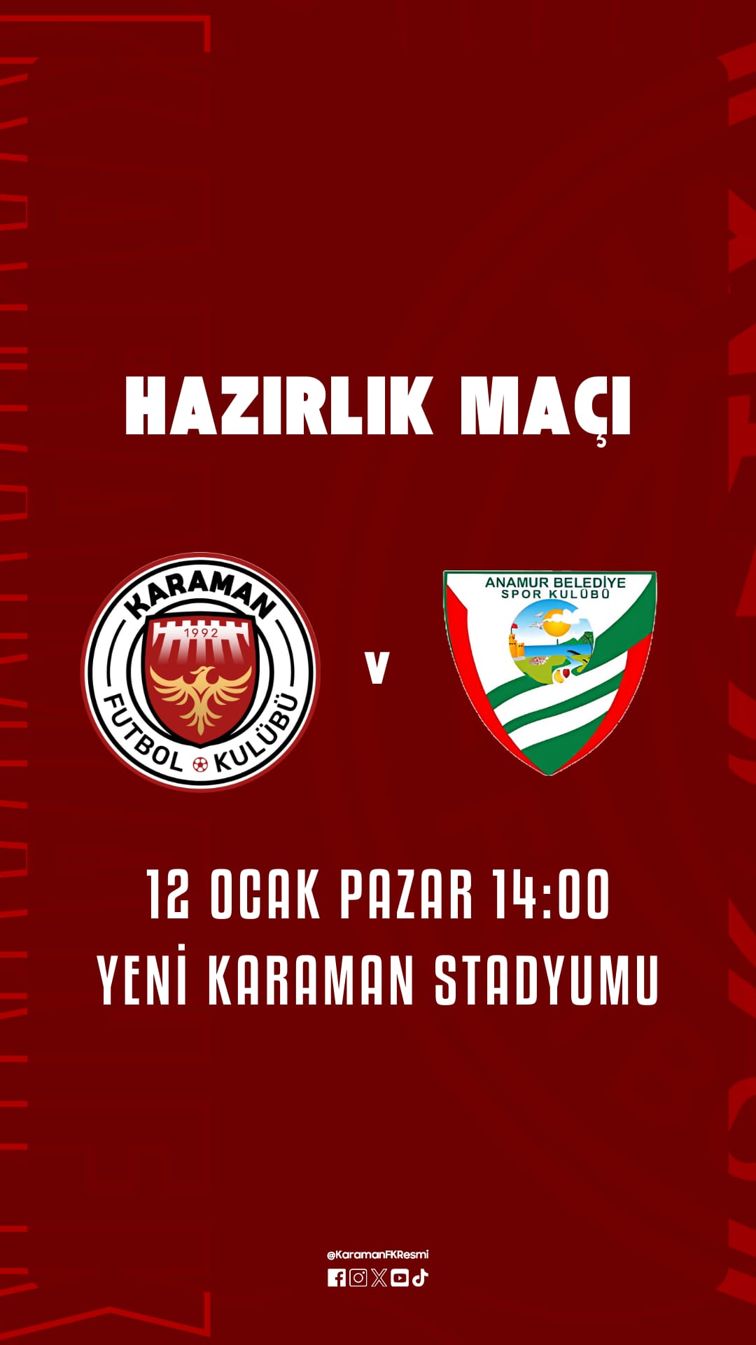 Karaman Futbol Kulübü Anamur Belediyespor ile kendi evinde hazırlık maçına çıkacak. Saat 14:00'da başlayacak olan müsabaka Yeni Karaman Stadyumunda oynanacak.Yeni başkanın kulübün başına geçmesi ile ikinci sezona hazırlanan temsilcimiz Mersin temsilcisini kendi evinde ağırlayacak.Yer: Yeni Karaman StadyumuSaat: 14:00