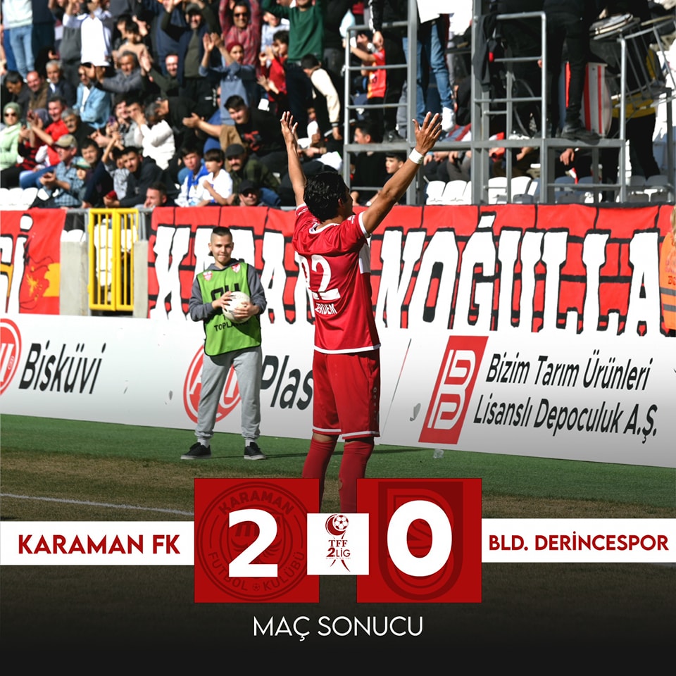 Kendi seyircisi önünde müthiş bir seri yakalayan Karaman Futbol Kulübü, 4 aydır Karaman'da maç kaybetmiyor. Bu süreçte sadece geride bıraktığımız haftada İskenderunspor ile berabere kalarak puan kaybı yaşadı. Karaman FK, kendi evinde en son 18 Ekim 2023 tarihinde Amed Sportif'e 1-2 kaybetmişti.TFF 2. Lig Kırmızı Grup'taki 26. maçında Derince Beldiyespor'u Karaman Şehir Stadyumunda konuk eden Karaman FK, karşılaşmayı 2-0 kazandı.Saat 14:00'te başlayan mücadeleyi Hakem Berkan Çetin yönetti. İlk yarısı golsüz eşitlikli tamamlanan maçın gollerini, Karaman FK adına 49. dakikada Erdem Dikbasan ile uzatma dakikalarında oyuna dahil olan Polat Akbay 90+6'da kaydetti. Maçın 80. dakikasında Derincesporlu oyuncu Taha Aydınlı kırmızı kart gördü.Karaman FK, ligde puanını 38'e yükselterek 8. sıraya yerleşti. Karaman FK, bir sonraki lig maçına 2 Mart tarihinde Amed Sportif deplasmanında çıkacak.