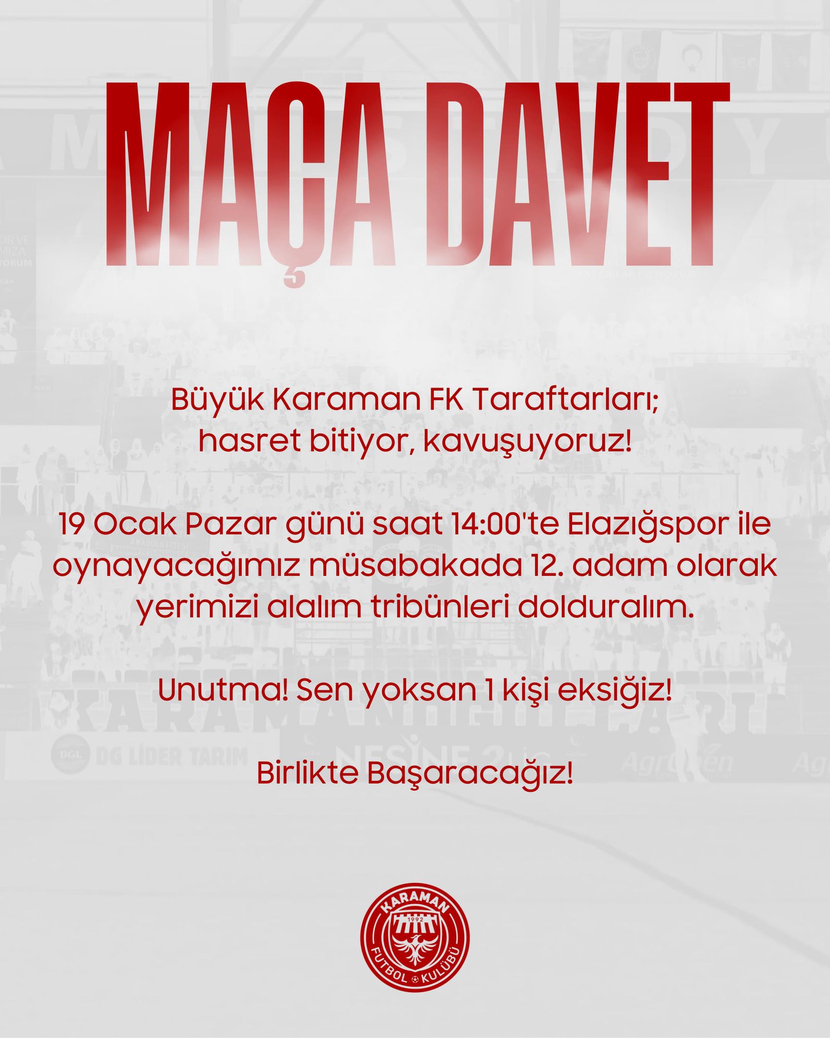 Karaman Futbol Kulübü bu hafta oynanacak maç için tüm Karaman halkını davet etti.TFF 2. Ligde 9. sırada bulunan temsilzimiz Karaman Futbol Kulübü bu hafta zorlu rakip Elazsığspor ile karşılaşacak.Pazar günü saat 14:00'da başlayacak mücadele Yeni Karaman Stadyumunda oynanacak. Karaman Futbol Kulübü Başkanı Ramazan Aygündüz taraftarları stada beklediğini açıklarken şunları söyledi;"Büyük Karaman FK taraftarları; hasret bitiyor, kavuşuyoruz.19 Ocak Pazar günü saat 14:00'da Elazığspor ile oynayacağımız müsabakada 12. adam olarak yerimizi alalım, tribünleri dolduralım.Unutma! Sen yoksan 1 kişi eksiğiz. Birlikte başaracağız."