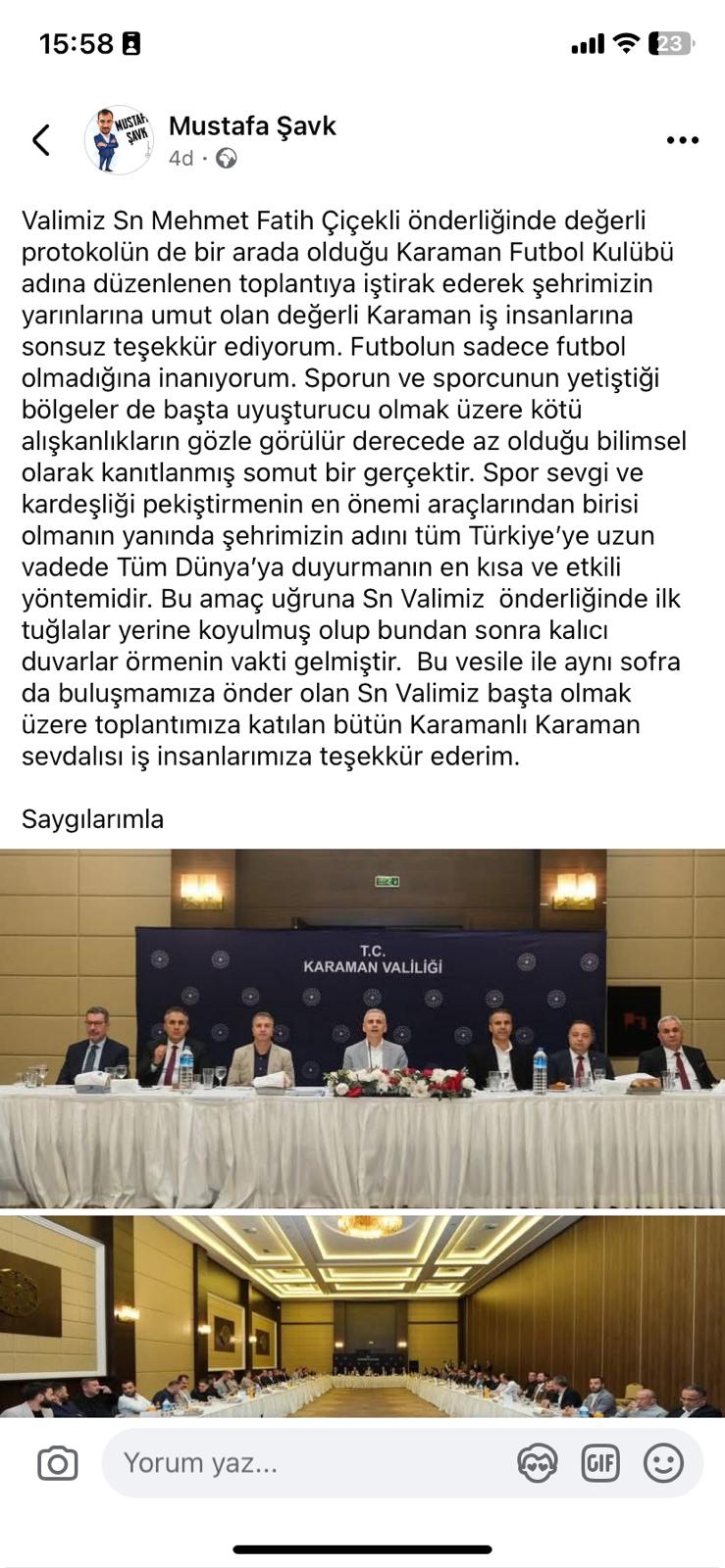 Karaman'da geçtiğimiz günlerde misafir olarak gelen Hoşgörü şehir Karaman'a gelen Mersin İdman Yurdu kulübü taraftarları, şehrin kulübüne ağır maddi hasar verdi. Kulüpğ yöneticilerinden ve Kulüpten eleştirel açıklamalar geldi.Kırmızı Beyazlı takımın taraftarlarından gelen ağır tepkiler sonrası şehirde yeni gündem oluştu.Karaman Valisi Mehmet Fatih Çiçekli bugün şehrimizin temsilcisi Karaman FK yöneticileri ile toplantı düzenledi.Toplantı sonrası açıklama yapan Karaman Futbol Kulübü AS Başkan Yardımcısı Mustafa Şavk, Vali Çiçekli'ye teşekkürlerini sundu. Başkan Yardımcısı Şavk şunları söyledi;"Valimiz Sn. Mehmet Fatih Çiçekli önderliğinde değerli protokolün de bir arada olduğu Karaman Futbol Kulübü adına düzenlenen toplantıya iştirak ederek şehrimizin yarınlarına umut olan değerli Karaman iş insanlarına sonsuz teşekkür ediyorum. Futbolun sadece futbol olmadığına inanıyorum. Sporun ve sporcunun yetiştiği bölgeler de başta uyuşturucu olmak üzere kötü alışkanlıkların gözle görülür derecede az olduğu bilimsel olarak kanıtlanmış somut bir gerçektir. Spor sevgi ve kardeşliği pekiştirmenin en önemi araçlarından birisi olmanın yanında şehrimizin adını tüm Türkiye'ye uzun vadede Tüm Dünya'ya duyurmanın en kısa ve etkili yöntemidir. Bu amaç uğruna Sn. Valimiz önderliğinde ilk tuğlalar yerine koyulmuş olup bundan sonra kalıcı duvarlar örmenin vakti gelmiştir. Bu vesile ile aynı sofra da buluşmamıza önder olan Sn Valimiz başta olmak üzere toplantımıza katılan bütün Karamanlı Karaman sevdalısı iş insanlarımıza teşekkür ederim."