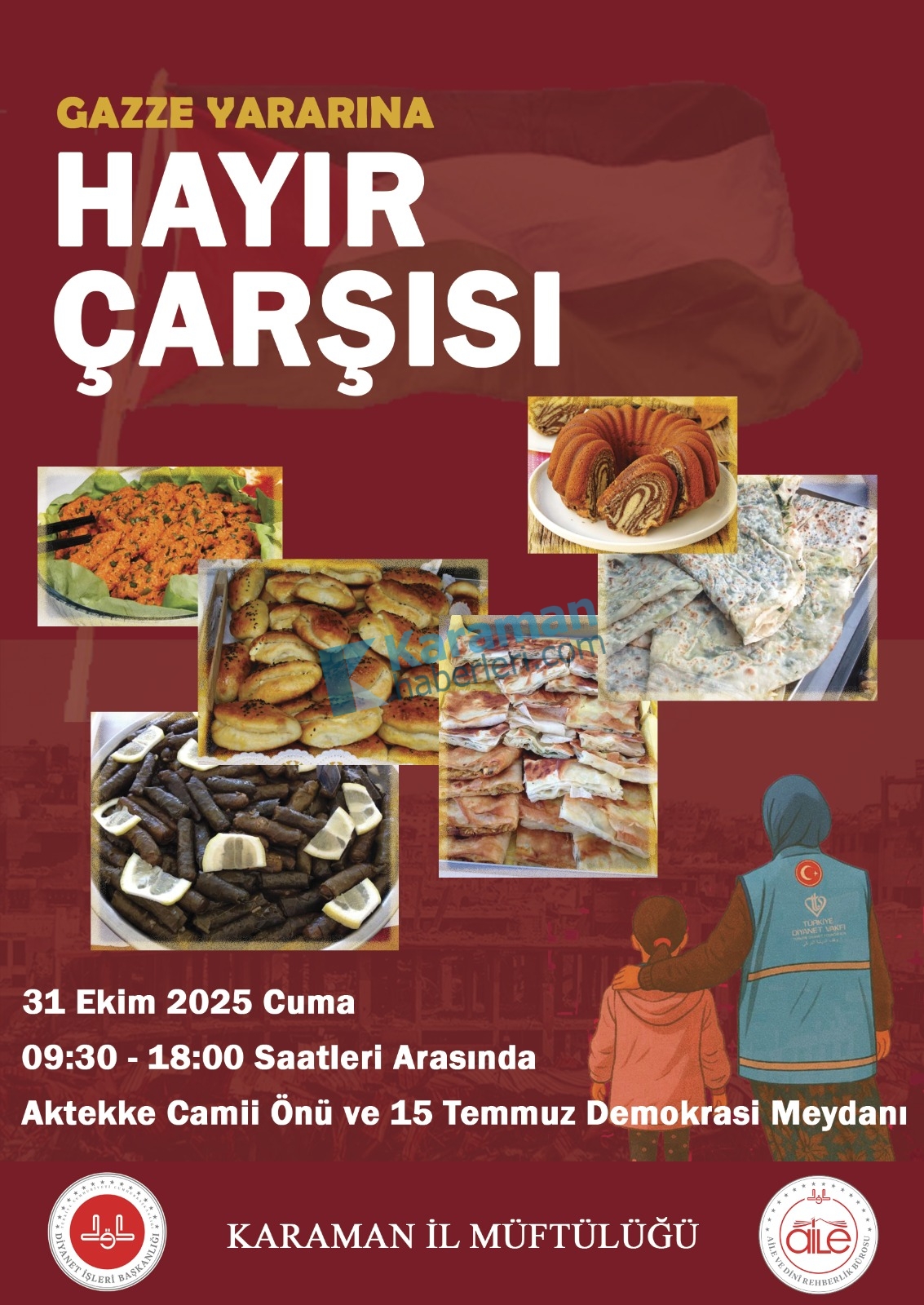 Karaman İl Müftülüğü, Gazze’de yaşanan insani krize dikkat çekmek ve yardım eli uzatmak amacıyla “Gazze Yararına Hayır Çarşısı” düzenliyor. Etkinlikte elde edilecek gelir, Gazze’deki ihtiyaç sahiplerine ulaştırılacak.Müftülükten yapılan açıklamada, “Birlik olalım, yaralara merhem olalım. El emeği yiyecek ve çeşitli ürünlerle destek sizden, ihtiyaç sahiplerine ulaştırmak bizden” ifadelerine yer verildi.Hayır çarşısı, 31 Ekim Cuma günü saat 09.30 ile 18.00 arasında Aktekke Camii Önü ve 15 Temmuz Demokrasi Meydanı’nda kurulacak.Karaman İl Müftülüğü, tüm Karaman halkını bu anlamlı etkinliğe katılarak Gazze’deki kardeşlerimize destek olmaya davet etti.