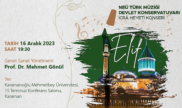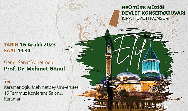 Konserde Necmettin Erbakan Üniversitesi (NEÜ) Türk Müziği Devlet Konservatuvarı İcra Heyeti, repertuarından seçkin eserler sunacak. KMÜ Yunus Emre Yerleşkesi 15 Temmuz Konferans Salonunda 16 Aralık Cumartesi günü saat 19.30’da başlayacak konser, sanatseverleri bir araya getirecek.Rektör Gavgalı’dan Konsere DavetKaramanoğlu Mehmetbey Üniversitesi Rektörü Prof. Dr. Mehmet Gavgalı, konuyla ilgili yaptığı açıklamada vuslat etkinlikleri kapsamında organize edilen konsere tüm Karamanlıları davet etti. NEÜ Türk Müziği Devlet Konservatuvarı İcra Heyeti’nin adeta bir müzik şöleni sunacağını ifade eden Gavgalı, “Üniversitemizin personeli ile birlikte tüm Karamanlı vatandaşlarımızı Cumartesi akşamı 15 Temmuz Konferans Salonunda gerçekleştirilecek ‘Elif’ adlı konsere bekliyoruz.” ifadelerini kullandı.Gavgalı’dan ‘Vuslat’ MesajıRektör Gavgalı, Hazreti Mevlana’nın 750. Vuslat Yıl Dönümü vesilesiyle de bir mesaj yayımladı. Anadolu topraklarının çok zengin bir manevi hazineye sahip olduğunu belirten Prof. Dr. Gavgalı, Yunus Emre, Mevlana Celaleddin-i Rumi ve Hacı Bayram-ı Veli gibi gönül erlerinin öğretilerinin sevgi, şefkat, birlik, beraberlik ve kardeşliği yeşerttiğini kaydetti. Mevlana’nın asırlar öncesinden verdiği mesajlara bugün tüm dünyanın çok daha fazla ihtiyacı olduğunu ifade eden Gavgalı, “Büyük İslam âlimi, mütefekkir, mutasavvıf ve gönül sultanı Mevlana Celaleddin-i Rumi’yi vuslatının 750. sene-i devriyesinde rahmetle yâd ediyorum." ifadelerini kullandı.