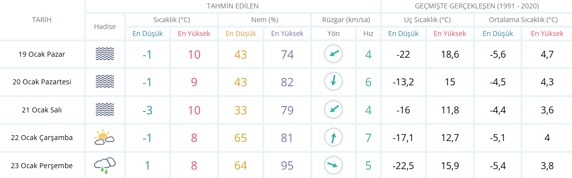 19 Ocak Pazar:Sisli hava tüm gün boyunca etkili olacak. En düşük sıcaklık -1°C, en yüksek sıcaklık ise 10°C civarında. Nem oranı %43 ile %74 arasında değişecek.