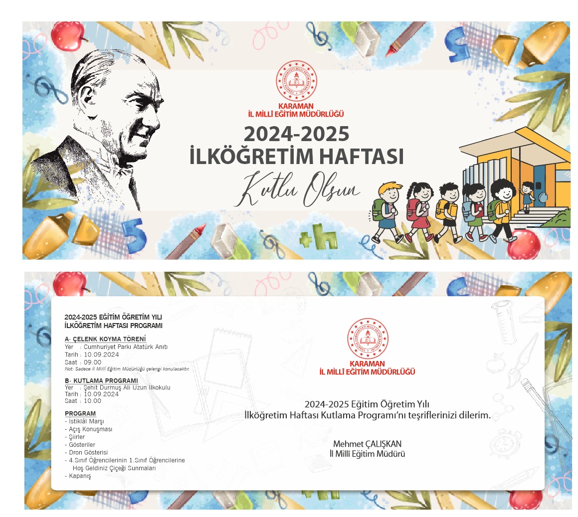 Karaman İl Milli Eğitim Müdürlüğü olarak 2024-2025 Eğitim Öğretim Yılı İlköğretim Haftası Kutlama Programı kapsamında gerçekleştireceğimiz etkinliklere sizi de aramızda görmekten onur duyarız.Program detayları aşağıda yer almaktadır:A- Çelenk Koyma Töreni