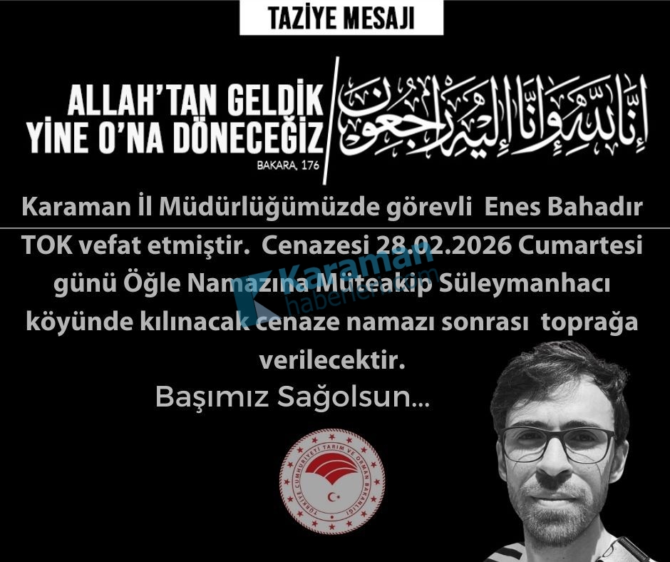Karaman İl Tarım ve Orman Müdürlüğü personeli Enes Bahadır Tok kalp krizi nedeniyle hayatını kaybetti. Merhumun cenazesinin, Süleymanhacı köyünde öğle namazını müteakip kılınacak cenaze namazının ardından defnedilecek.Karamanhaberleri.com ailesi olarak merhuma Allah’tan rahmet, ailesine ve yakınlarına başsağlığı dileriz.