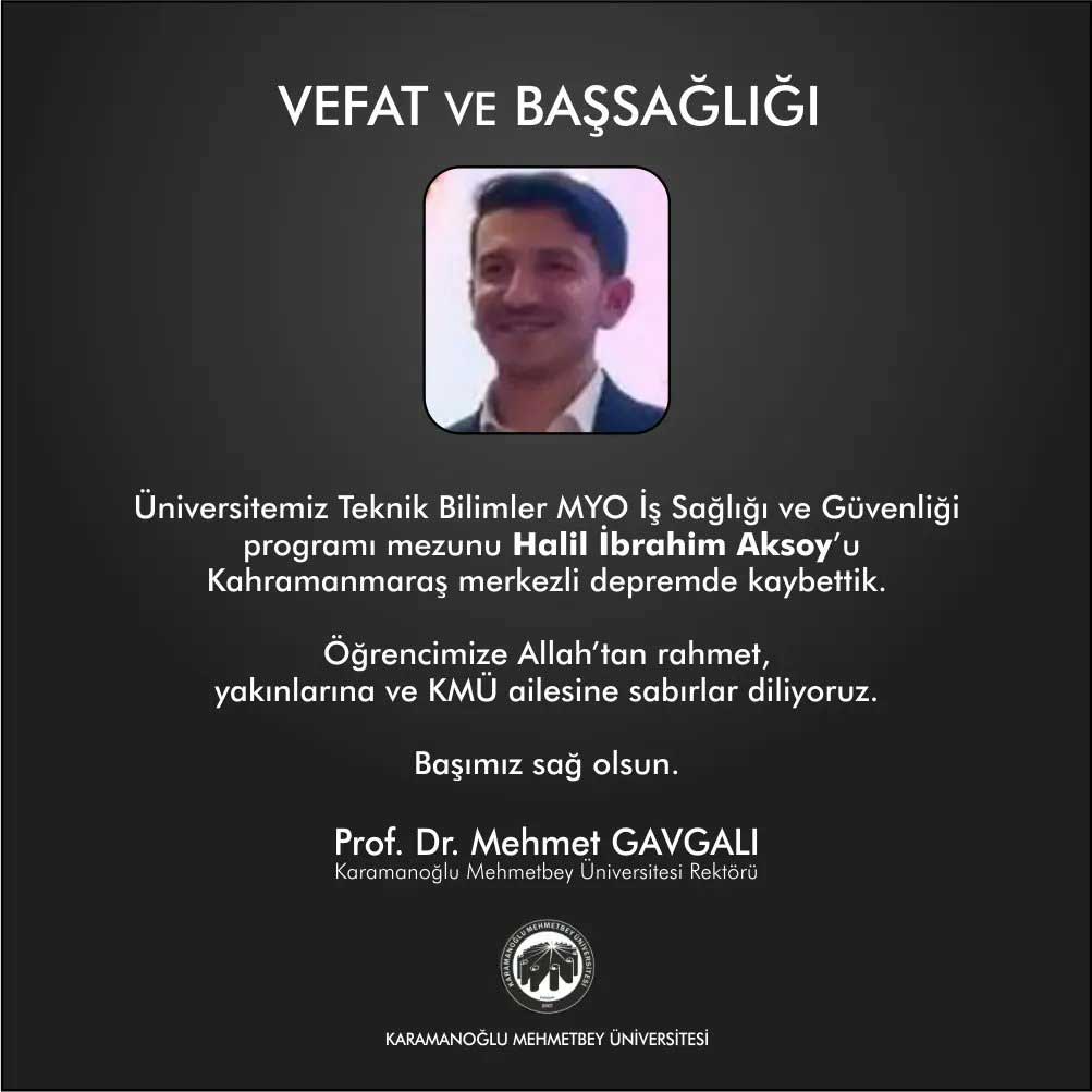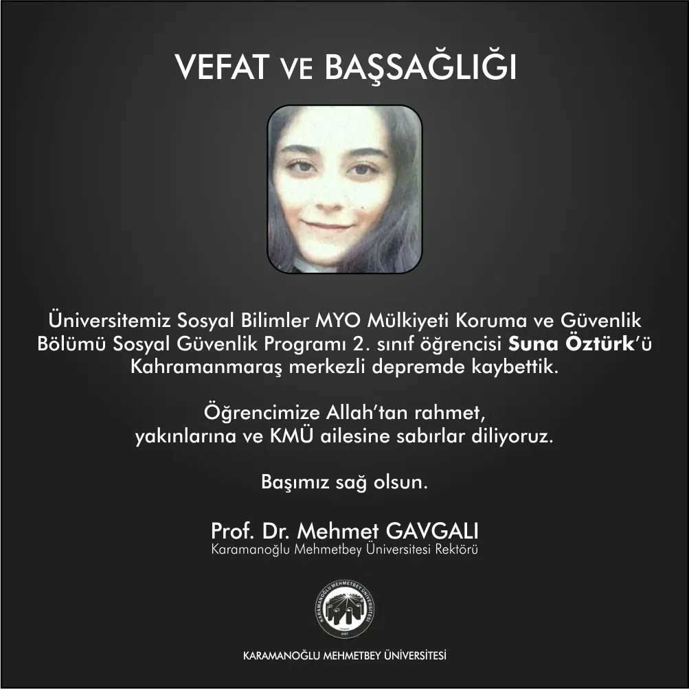 Kahramanmaraş merkezli 10 ilde büyük yıkıma sebep olan deprem felaketinden acı haberler de gelmeye devam ediyor.Alınan son bilgilere göre, Karamanoğlu Mehmetbey Üniversitesi'nin biri mezun, diğeri aktif öğrenci olmak üzere 2 öğrencisinin daha deprem felaketinde vefat ettikleri öğrenildi.KMÜ'den başsağlığı mesajı da yayınlanan 2 öğrencinin;