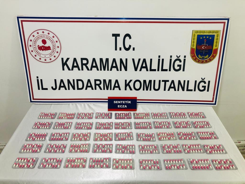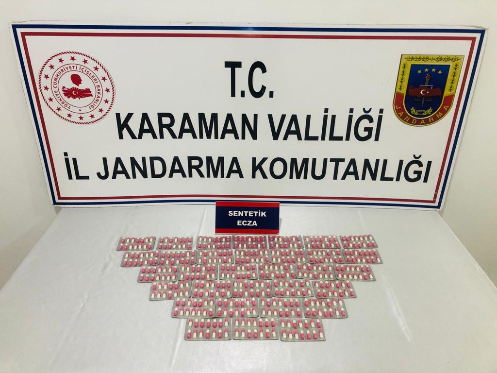 Karaman İl Jandarma ekipleri makul şüphe üzerine yaptıkları üst aramasında iki kişide sentetik ecza hapı tespit ederek şüphelileri gözaltına aldı.Karaman Cumhuriyet Başsavcılığı Kordinesinde Karaman İl Jandarma Komutanlığı tarafından Uyuşturucu ile mücadele kapsamında şüpheli F.K ve İ.D. isimli şahıslara yönelik icra edilen faaliyet sonucunda 1078 Adet Sentetik Ecza Hap ele geçirildi. Şüpheliler jandarmadaki sorgularının ardından adli mercilere sevk edildi.