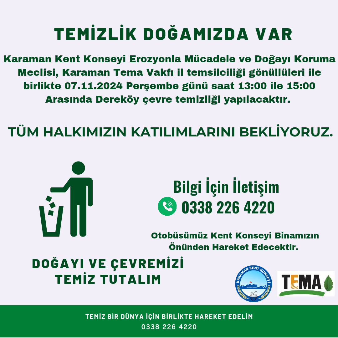 Kent Konseyi Erozyonla Mücadele ve doğayı koruma meclisi, Tema Vakfı İl temsilciliği gönüllüleri ile birlikte 07.11.2024 Perşembe günü saat 13.00 ile 15.00 arasında Dereköy çevre temizliği yapacak.Konsey binası önünden başlayacak etkinlik için temin edilen otobüslerle saat 13.00 de hareket edilecek ve etkinlik 2 saat sürerek saat 15.00’de sonlandırılacak. Çevre ve temizlik konusunda önemli bu etkinliğe tüm Karaman halkı davet edildi.