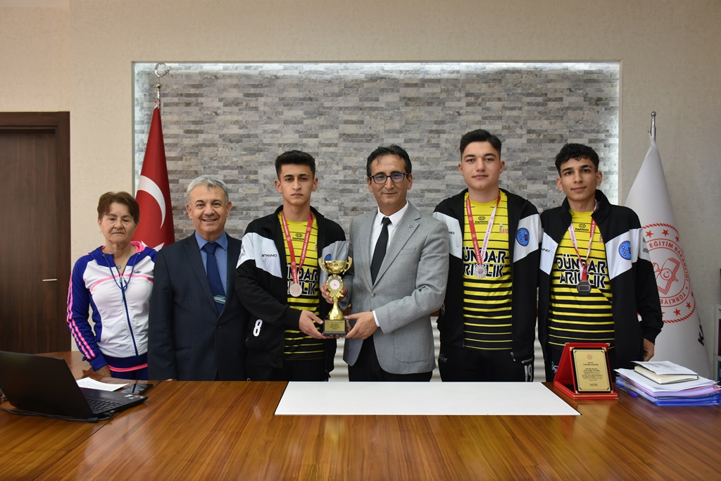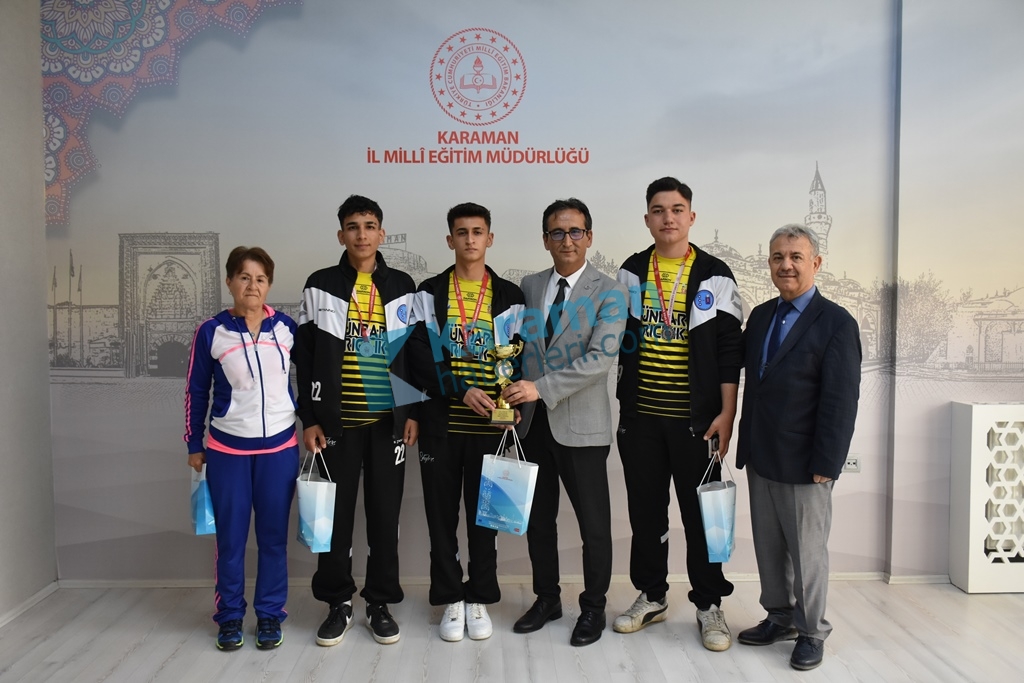 17-19 Nisan 2026 tarihlerinde gerçekleştirilen organizasyonda Karaman’ı temsil eden Fatih Anadolu Lisesi takımı, güçlü rakiplerini geride bırakarak Türkiye üçüncülüğünü kazandı.Başarılı sporcular Yasin Özkan, Turgut Demir ve Murat Can Aydın, Okul Müdürü Hasan Erkan ile Beden Eğitimi Öğretmeni Nurcan Yıldızoğlu eşliğinde Karaman İl Milli Eğitim Müdürü Mehmet Çalışkan’ı ziyaret etti.FLOOR CURLING NEDİR?Floor Curling, buz yerine düz zeminde oynanan ve stratejiye dayalı takım sporudur. Oyuncular, özel taşları hedef daireye en yakın noktaya ulaştırmaya çalışır. Dikkat, denge, planlama ve takım uyumu gerektiren branş, son yıllarda okullarda yaygınlaşmaya başladı.BAŞARI TESADÜF DEĞİLZiyarette konuşan Okul Müdürü Hasan Erkan, öğrencilerin ders dışındaki zamanlarını verimli kullanarak disiplinli şekilde hazırlandığını belirtti. Takımın özverili çalışma sonucu bu başarıya ulaştığını ifade etti.İl Milli Eğitim Müdürü Mehmet Çalışkan ise elde edilen sonucun azim, emek ve kararlılığın göstergesi olduğunu söyledi. Öğrencilerin hem akademik hem sportif alanda gösterdiği performansın örnek olduğunu belirten Çalışkan, Karaman’ı başarıyla temsil eden öğrencileri ve emeği geçen eğitimcileri tebrik etti.Ziyaret, başarılı öğrencilerin ödüllendirilmesi ve hatıra fotoğrafı çekimiyle sona erdi.