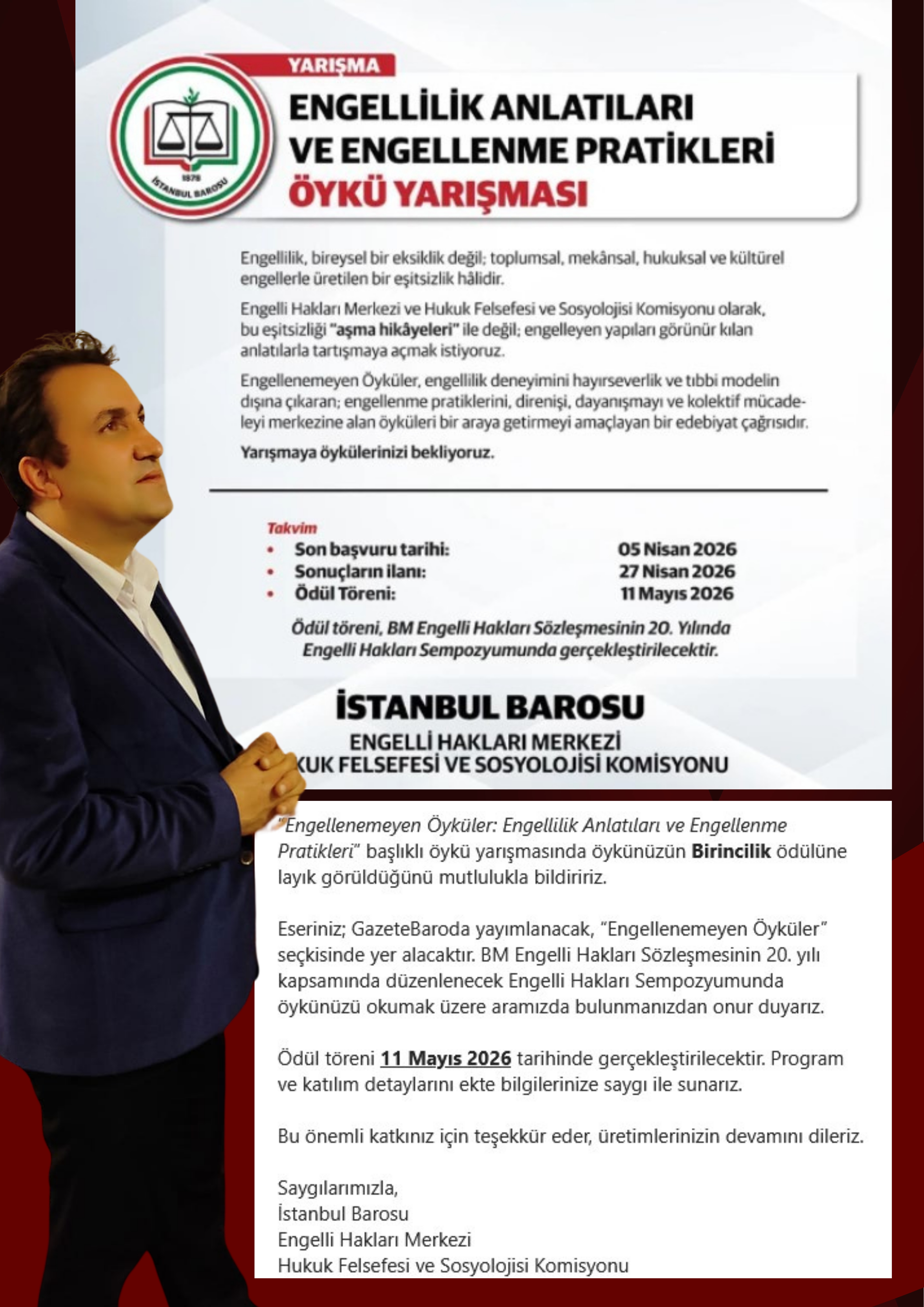 İstanbul Barosu Engelli Hakları Merkezi ile Hukuk Felsefesi ve Sosyolojisi Komisyonu tarafından düzenlenen “Engellilik Anlatıları ve Engellenme Pratikleri Öykü Yarışması” sonuçlandı. Yarışmada Karamanlı yazar İbrahim Şaşma’nın eseri jüri tarafından birincilik ödülüne değer bulundu.TOPLUMSAL FARKINDALIK TEMASIYLA DÜZENLENDİYarışma, engelliliği yalnızca bireysel eksiklik olarak değil; toplumsal, mekânsal, hukuksal ve kültürel engeller çerçevesinde ele alan anlatıları teşvik etmek amacıyla düzenlendi.Kazanan eserin, GazeteBaroda platformunda yayımlanacağı ve “Engellenemeyen Öyküler” seçkisinde yer alacağı bildirildi.ÖDÜL TÖRENİ MAYIS AYINDAYarışmanın ödül töreninin 11 Mayıs 2026 tarihinde, Birleşmiş Milletler Engelli Hakları Sözleşmesi’nin 20. yılı kapsamında düzenlenecek Engelli Hakları Sempozyumu’nda gerçekleştirileceği açıklandı.Karamanlı yazarın elde ettiği başarı, kent adına önemli kültürel başarı olarak değerlendirildi.