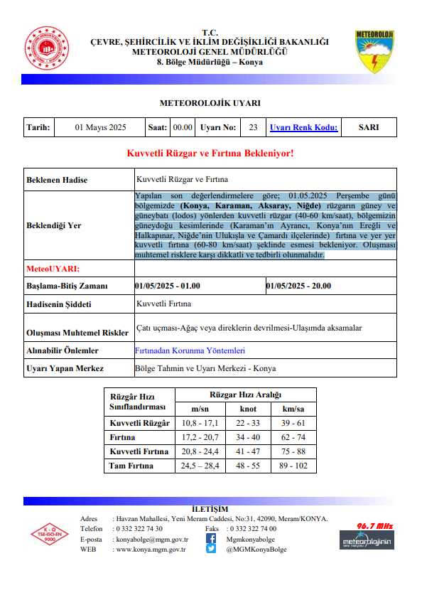 Meteoroloji Genel Müdürlüğü 8. Bölge Müdürlüğü Konya Bölge Tahmin ve Uyarı Merkezi, karaman ve çevresi için uyarıda bulundu. Yapılan açıklamalara göre 1 Mayıs Perşembe günü kuvvetli rüzgar esmesi beklenyor.Meteoroloji Genel Müdürlüğü 8. Bölge Müdürlüğü Konya Bölge Tahmin ve Uyarı Merkezi Karaman çevresi için açıklamalarda bulundu.Açıklamada şu ifadeler kullanıldı:Yapılan son değerlendirmelere göre; 01.05.2025 Perşembe günü bölgemizde (Konya, Karaman, Aksaray, Niğde) rüzgarın güney ve güneybatı (lodos) yönlerden kuvvetli rüzgar (40-60 km/saat), bölgemizin güneydoğu kesimlerinde (Karaman’ın Ayrancı, Konya’nın Ereğli ve Halkapınar, Niğde’nin Ulukışla ve Çamardı ilçelerinde) fırtına ve yer yer kuvvetli fırtına (60-80 km/saat) şeklinde esmesi bekleniyor. Oluşması muhtemel risklere karşı dikkatli ve tedbirli olunmalıdır.