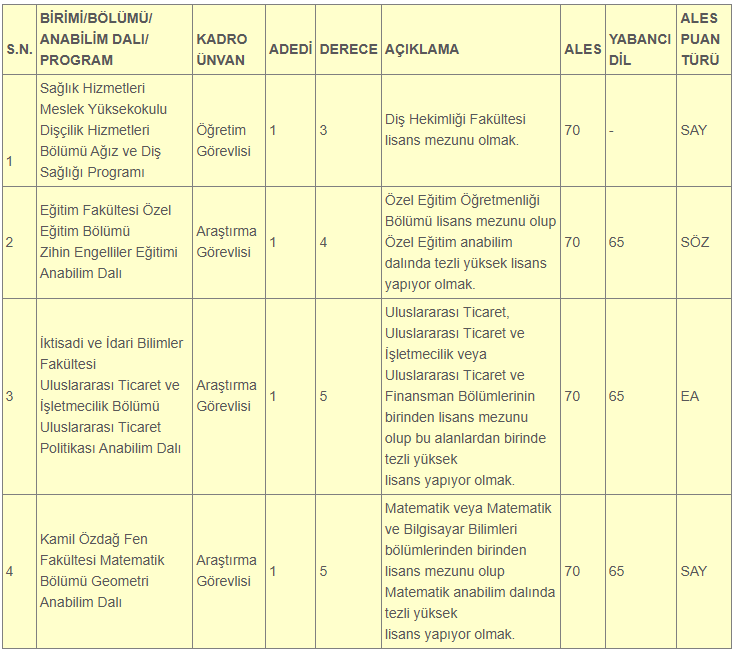 2- Öğretim üyesi dışındaki öğretim elemanı kadrolarına yapılacak atamalarda ALES’ten en az 70 puan almış olmak, Yükseköğretim Kurulu tarafından kabul edilen merkezi yabancı dil sınavından Meslek Yüksekokulları hariç öğretim görevlisi kadroları için en az 60 ve araştırma görevlisi kadroları için en az 65 puan (Üniversitemiz Senatosunca Belirlenen Puan) veya eşdeğerliği kabul edilen sınavdan bu puan muadili bir puan almış olmak gerekir.