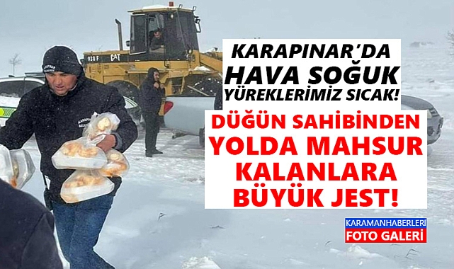 Düğün sahibi yolda kalanlara yemek dağıttı!Şehirden ve şehir dışından otobüs firmaları ile yada özel araçlarla Adana yoluna gitmek isteyenler vatandaşlar yolda kalarak büyük sorunlar yaşadı.Karapınar'da bir düğün sahibi Ali İhsan Bostan Karapınar'da yolda kalan yolculara düğün yemeklerini dağıttı. Bu soğuk havada yaptığı jest ile hem yürekleri hem de vatandaşların içlerini ısıtan Bostan, "Tipi ve buzlanma nedeniyle uzun kuyruklar oluştuğunu duyunca hemen harekete geçtik. Çünkü aralarında çocukların da olabiliceğini düşündüm. Yemeği, davetlilerimizin müsadesiyle paketleyip belediye ekiplerimizle dağıttık. İnsanların hayır duasını aldık. Bu mutluluk bize yeter.” dedi.Ayrıca Karapınar Belediye Başkanı İbrahim Önal yolcu otobüsündeki yolcuları otobüs terminalinde misafir ederek çay ve çorba dağıttı. Tipinin geçmesini bekleyen yolcular terminalde dinlendi.Yolunda açıldığını aktaran Önal şunları söyledi;"Yoğun kar yağışı sonrası yolda kalan vatandaşlarımızı yalnız bırakmayarak hayırsever hemşehrimiz Ali İhsan Bostan’ın katkılarıyla hazırlanan Karapınar yemeklerini, belediye ekiplerimiz aracılığıyla kendilerine ulaştırdık.Birlik ve dayanışma içinde her zorluğun üstesinden geliyoruz. Değerli hemşerimiz Ali İhsan Bostan’a bu anlamlı destek için teşekkür ediyoruz.İlçe otogarımızda misafir ettiğimiz vatandaşlarımıza sıcak çorba, çay ve her türlü ihtiyaçlarını karşılayacak ikramlarda bulunduk.Ayrıca çevre yolumuz an itibariyle trafiğe açılmış olup vatandaşlarımızdan güvenlikleri için trafik kurallarına uymalarını önemle rica ediyorum."