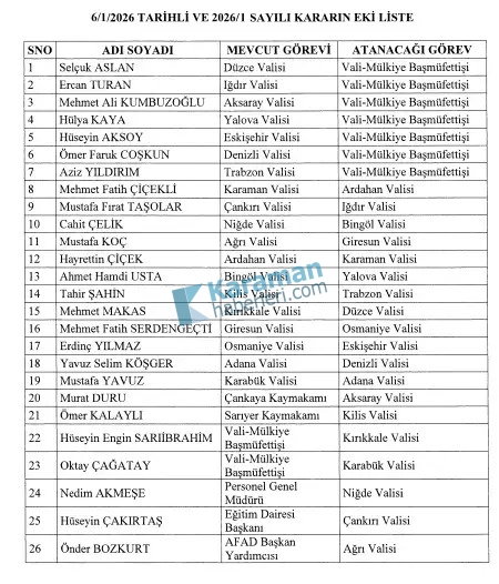 Cumhurbaşkanı Recep Tayyip Erdoğan’ın onayıyla hazırlanan Valiler Kararnamesi, Resmi Gazete’de yayımlanarak resmen yürürlüğe girdi. Kararname kapsamında Türkiye genelinde birçok ilde vali ataması gerçekleştirildi.