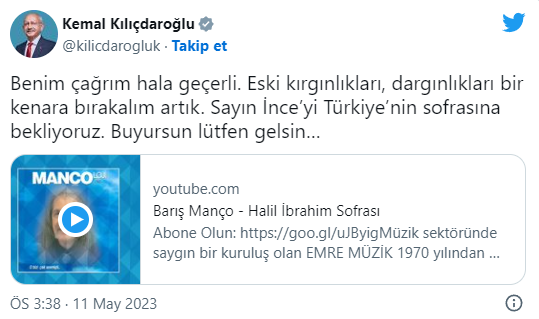 Cumhurbaşkanı adayı Kemal Kılıçdaroğlu, Cumhurbaşkanlığı adaylığından çekilen Memleket Partisi Genel Başkanı Muharrem İnce'ye "Halil İbrahim sofrası" çağrısında bulundu.Kemal Kılıçdaroğlu, Twitter'dan Barış Manço'nun "Halil İbrahim Sofrası" parçasıyla Muharrem İnce'ye çağrı yaptı.Kılıçdaroğlu, "Benim çağrım hala geçerli. Eski kırgınlıkları, dargınlıkları bir kenara bırakalım artık. Sayın İnce’yi Türkiye’nin sofrasına bekliyoruz. Buyursun lütfen gelsin" dedi.